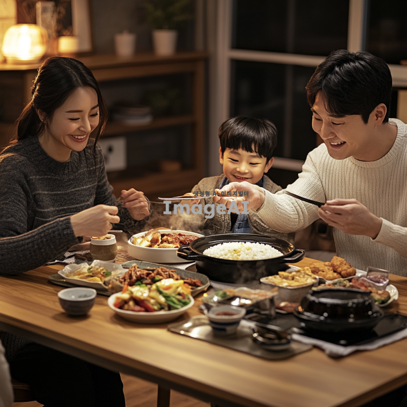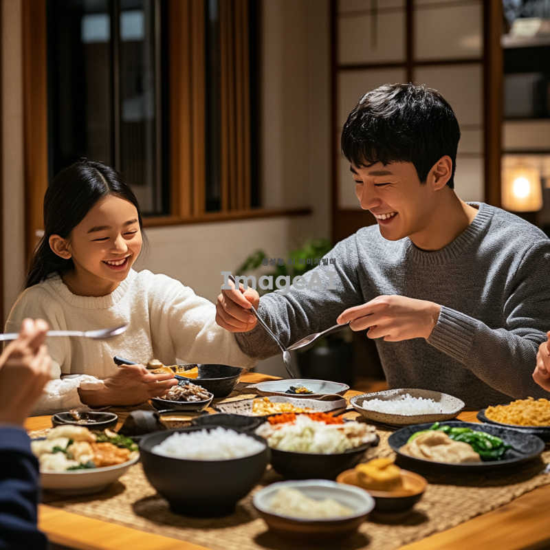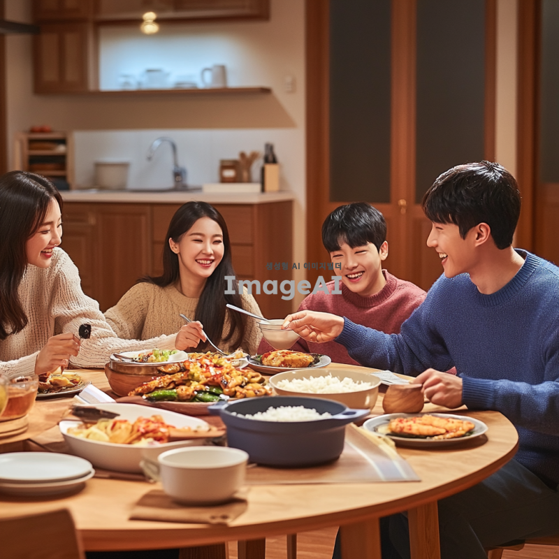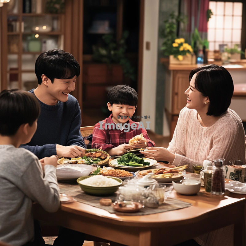김민호가 가족들과 함께 따뜻한 저녁 식사를 즐기고 있는 모습. 아늑한 식탁에 다양한 반찬과 밥이 놓여 있고, 가족들이 웃으며 대화하고 있는 장면. 배경은 아늑한 가정집의 식사 공간, 따뜻한 조명 아래에서 행복한 분위기가 느껴지는 모습.