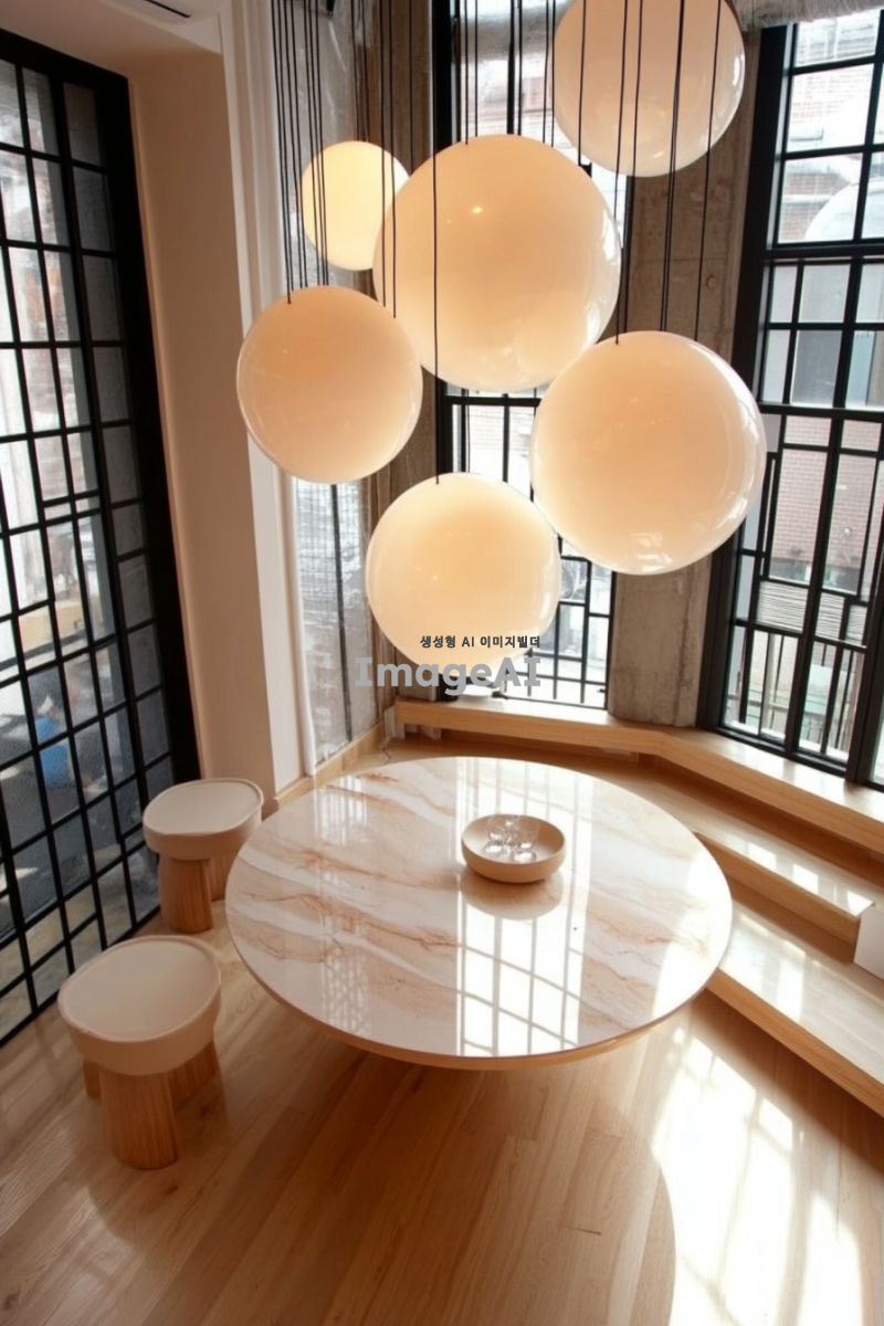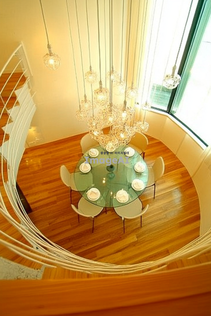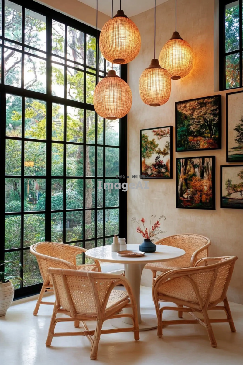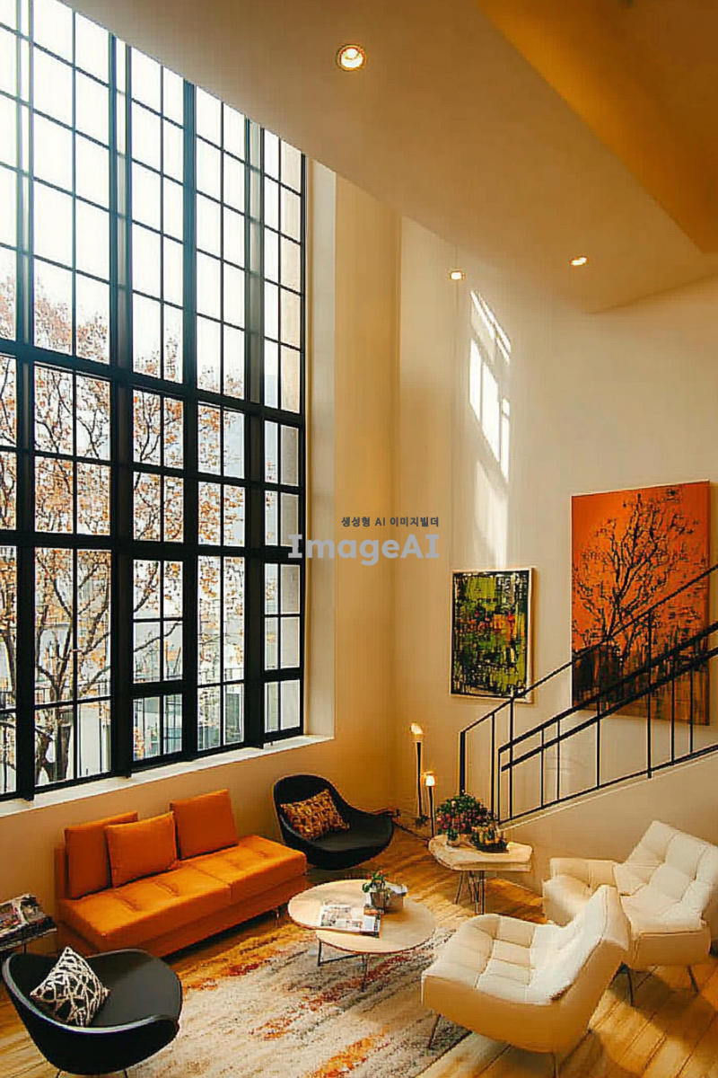 아름답게 조명된 현대적인 한국의 집 내부, 따뜻한 조명과 세련된 가구가 조화를 이루는 공간, 다양한 조명의 효과로 아늑하고 환상적인 분위기를 연출, 창문을 통해 들어오는 자연광과 함께 조화롭게 어우러진 모습, 스타일리시한 인테리어와 아트워크가 돋보이는 장면