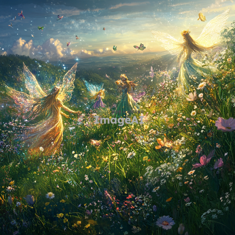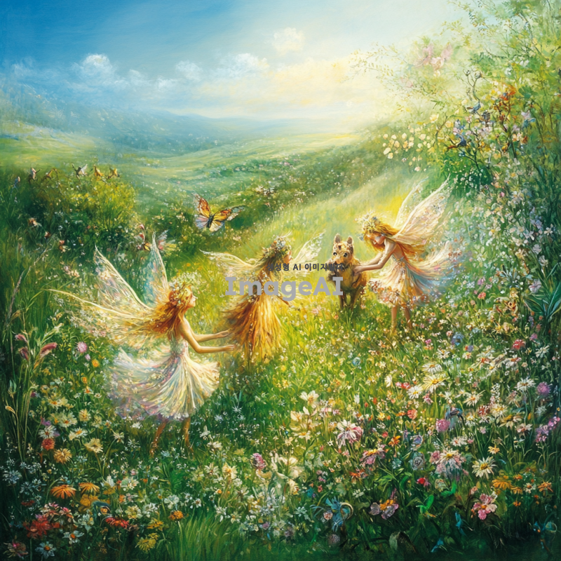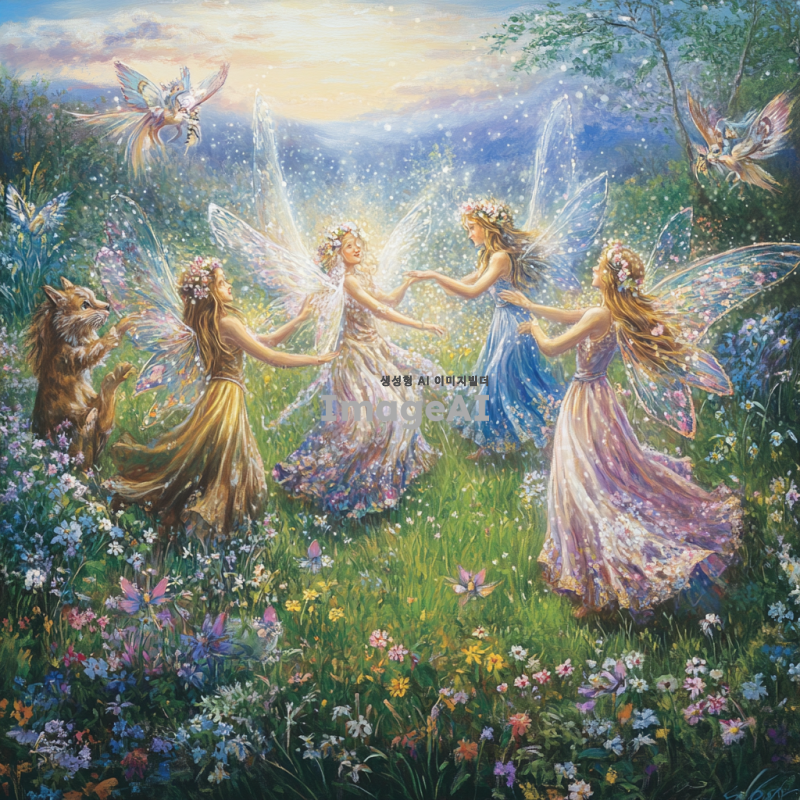 푸른 초원 위에 신비로운 요정들이 춤추고 있는 장면을 상상해 보세요. 다양한 색깔의 꽃들이 만발한 초원에서, 환상적인 동물들이 요정들과 함께 어우러져 있는 모습. 요정들은 반짝이는 날개를 가지고 있으며, 그 주위에는 빛나는 오라가 감싸고 있습니다. 하늘은 맑고 푸르며, 부드러운 구름이 떠 있는 풍경 속에서 자연의 아름다움과 환상적인 생명체들이 조화를 이루고 있는 장면을 그려주세요.