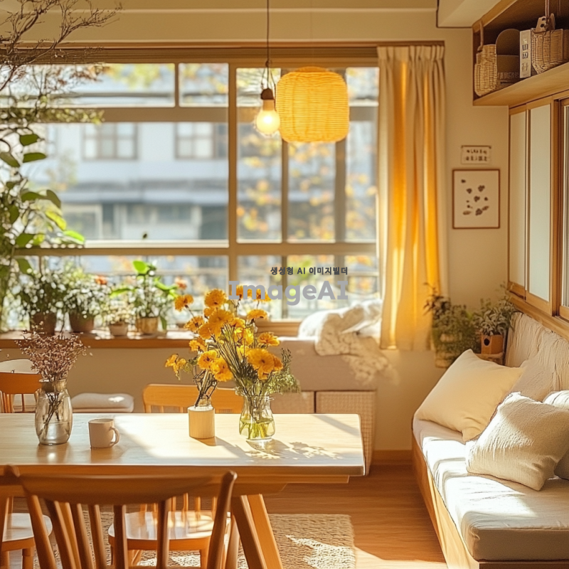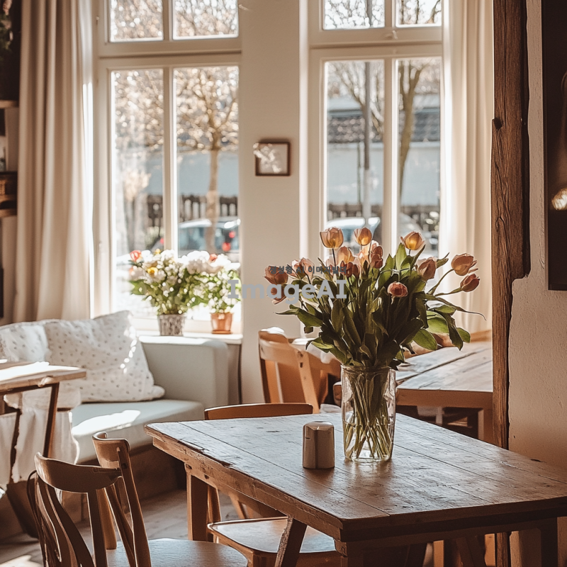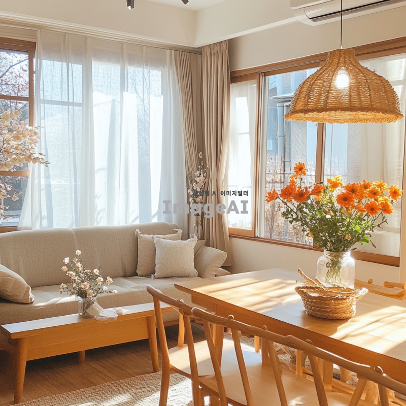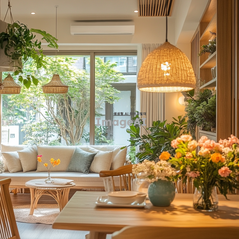 봄의 따뜻한 느낌을 주는 부드러운 웜톤 조명이 가득한 실내 공간, 창문을 통해 들어오는 자연광과 함께 화사한 꽃들이 놓여 있는 테이블, 아늑한 소파와 함께 편안한 분위기를 연출하는 공간, 부드러운 색감의 벽과 따뜻한 나무 소재의 가구들이 어우러진 모습.