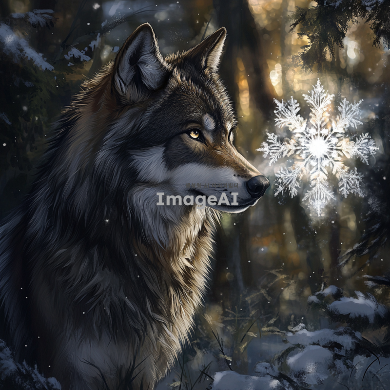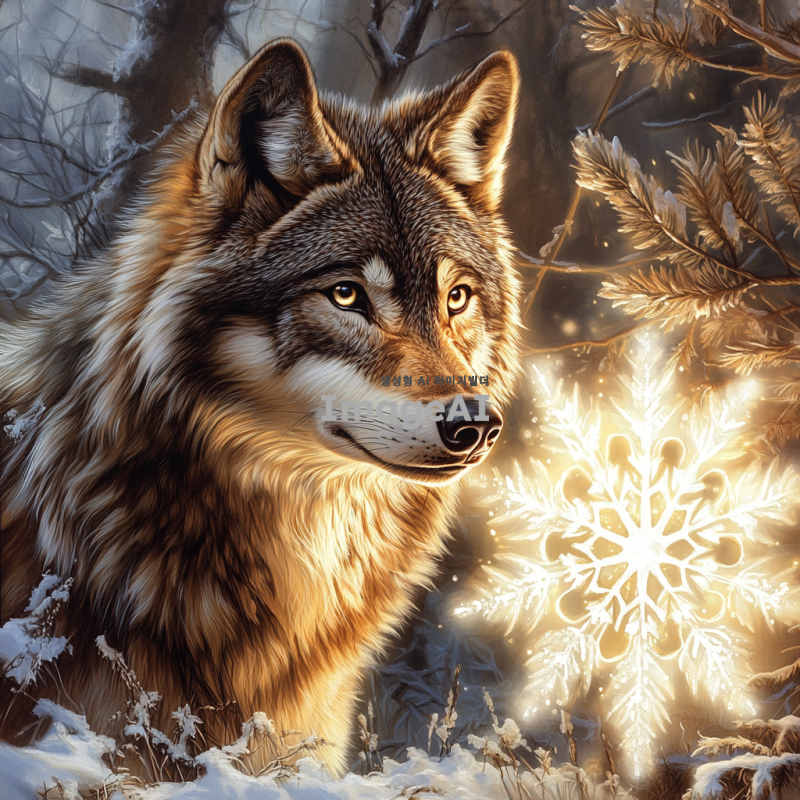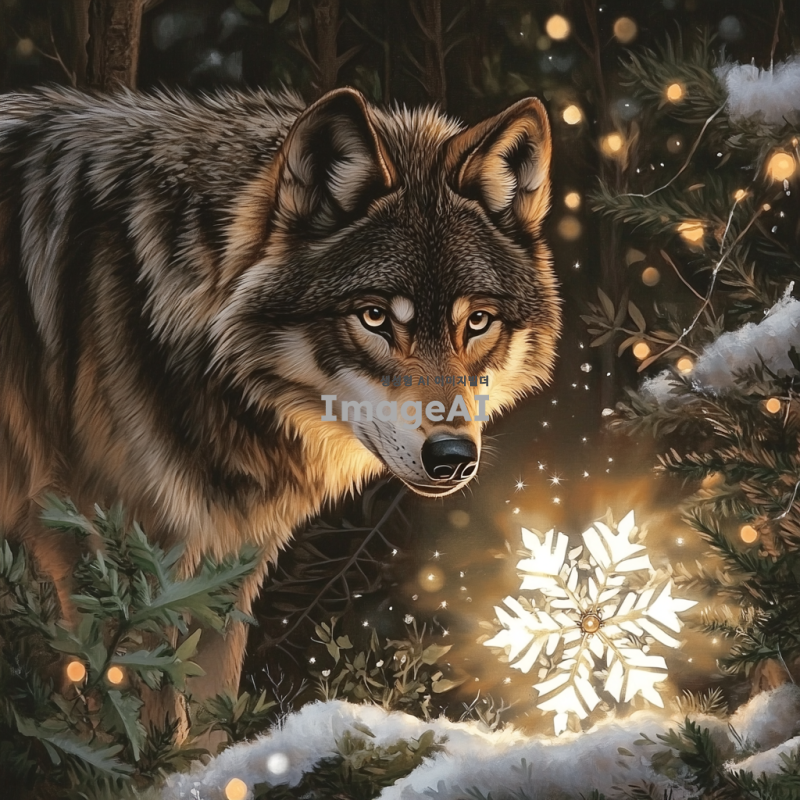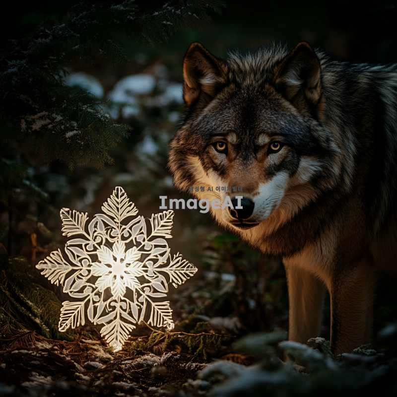 숲속에 있는 잘생긴 늑대가 하얀 눈모양 조명 옆에 서 있는 장면, 사실적인 스타일로 표현, 자연의 아름다움과 신비로운 분위기를 강조, 부드러운 조명과 세밀한 디테일로 늑대의 털과 눈빛을 생생하게 묘사.