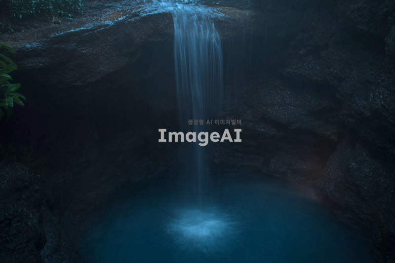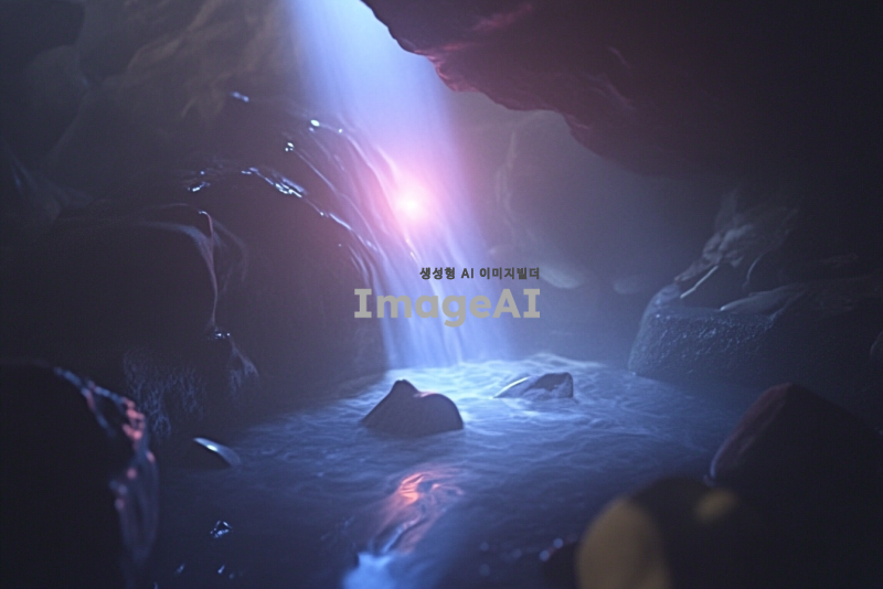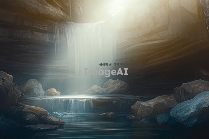 동굴 안 깊은 곳에서 한줄기 빛이 내려오는 장면, 빛은 신비롭고 아름다우며 따뜻한 느낌을 주는 조명, 주변은 어둡고 신비로운 분위기로 가득 차 있으며, 빛이 닿는 곳에는 부드러운 색감의 돌과 물이 반짝이고, 전체적으로 평화롭고 편안한 느낌을 주는 이미지.