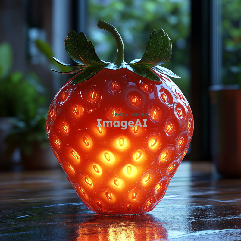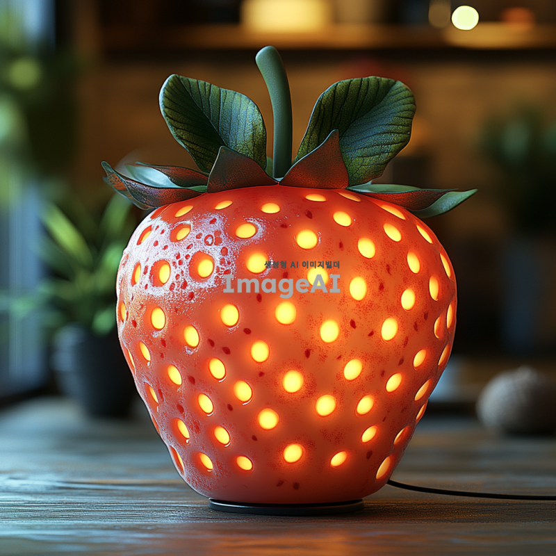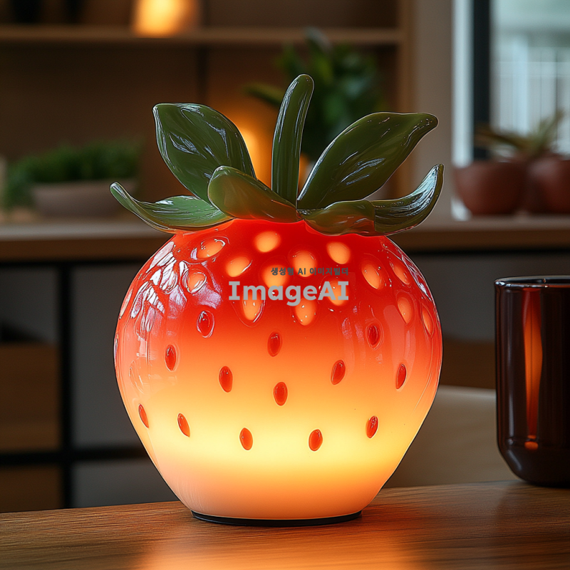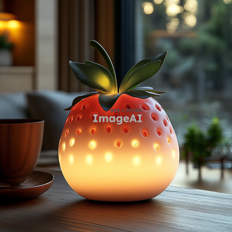 귀여운 딸기 모양의 조명이 어두운 방 안에서 부드러운 빛을 발하며, 아기자기한 인테리어와 조화를 이루는 모습. 딸기의 붉은 색상과 초록색 잎사귀가 강조되며, 조명이 켜진 상태에서 따뜻하고 아늑한 분위기를 연출하는 장면. 배경은 심플하고 깔끔하게, 조명이 중심이 되는 구도.