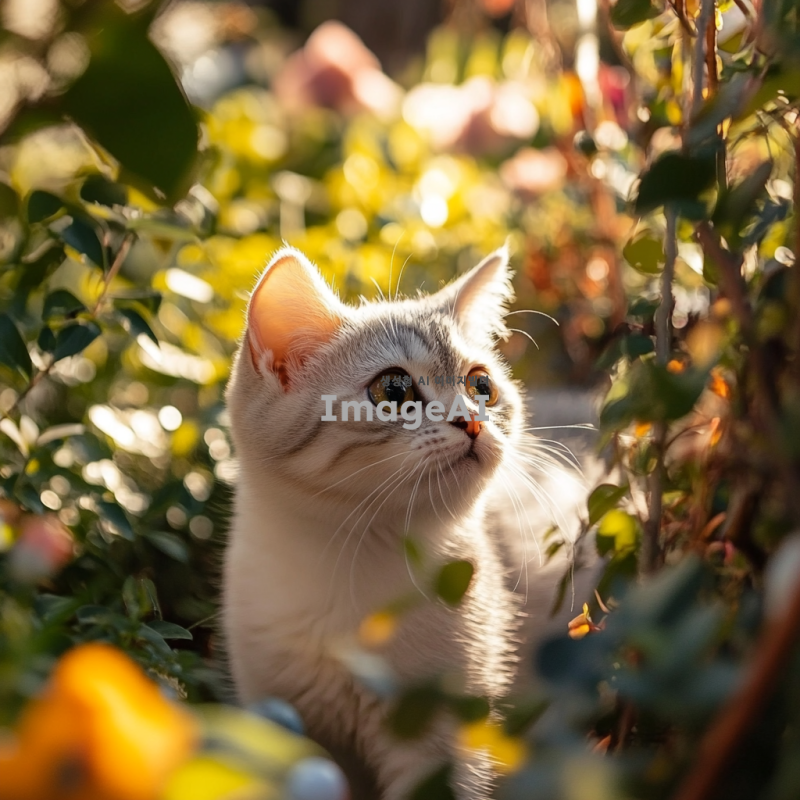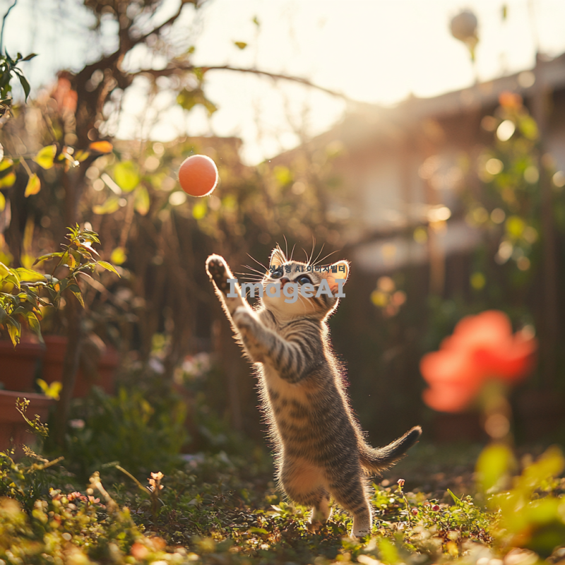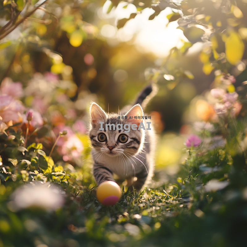 작고 귀여운 한국 고양이가 햇살 아래에서 놀고 있는 모습, 큰 눈과 동그란 얼굴, 부드러운 털, 주변에는 꽃과 나무가 가득한 아늑한 정원, 행복한 표정으로 장난감 공을 쫓아가는 모습