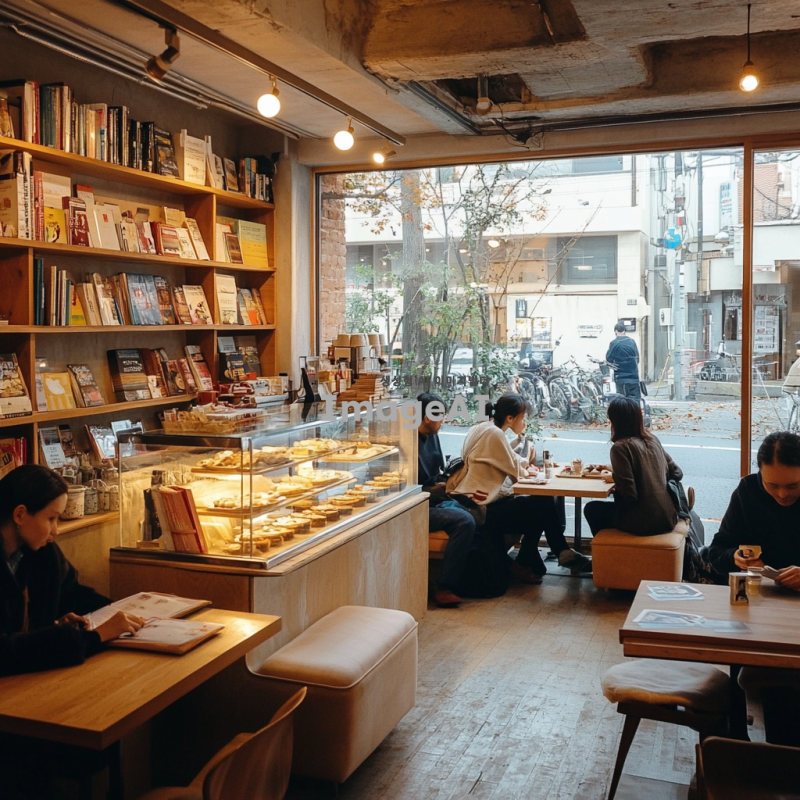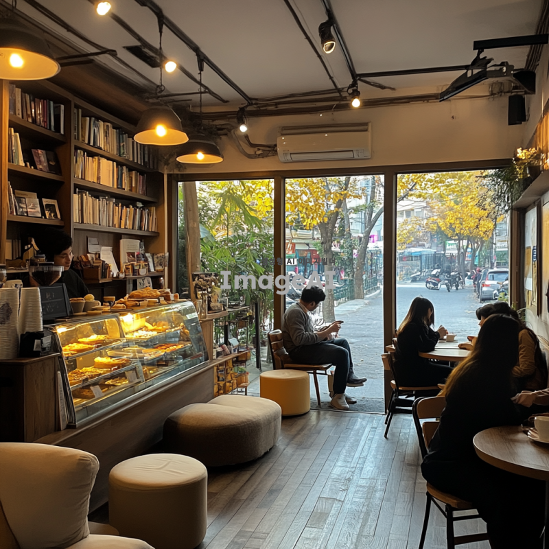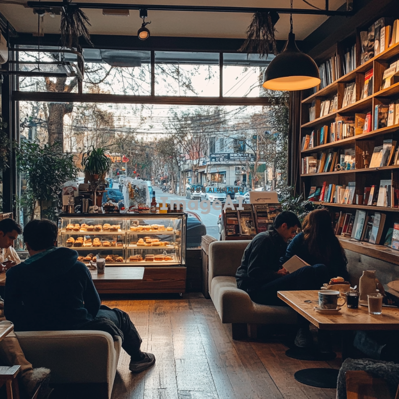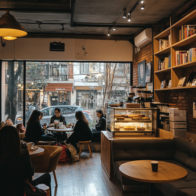 아늑하고 편안한 분위기의 카페 내부, 따뜻한 조명 아래 편안한 소파와 나무 테이블이 배치되어 있는 모습. 커피와 디저트가 진열된 카운터, 책장이 있는 한쪽 벽, 창문 밖으로 보이는 거리 풍경이 보인다. 카페에는 몇몇 사람들이 대화하며 여유로운 시간을 보내고 있고, 창가에 앉아 책을 읽고 있는 모습도 포함. 전체적으로 아늑하고 친근한 느낌을 주는 공간.