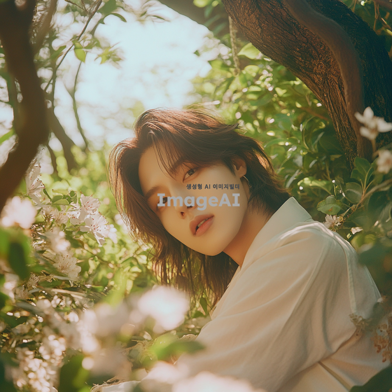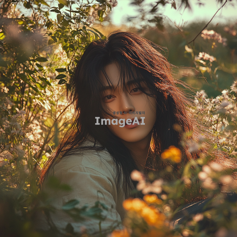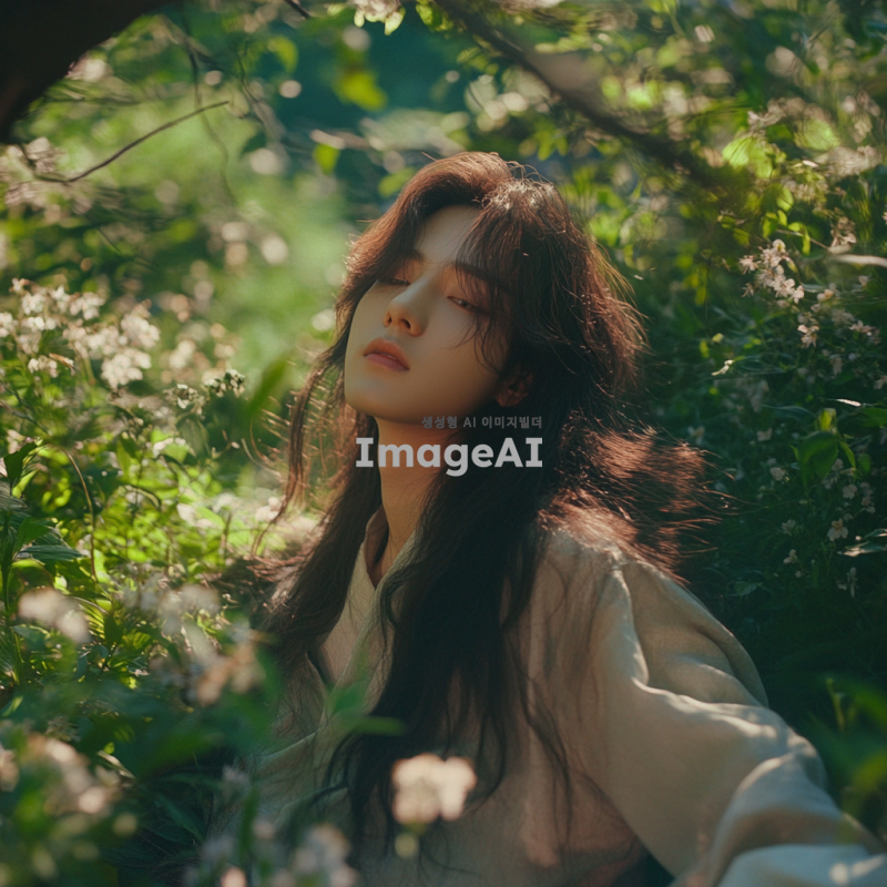 해찬의 긴 머리를 가진 한국 남성이 자연 속에서 편안하게 앉아 있는 모습. 그의 머리는 바람에 살랑이며, 따뜻한 햇살이 비추는 가운데, 주변에는 푸른 나무와 화사한 꽃들이 만발해 있다. 해찬은 캐주얼한 옷을 입고 있으며, 부드러운 미소를 지으며 카메라를 바라보고 있다. 배경은 평화롭고 아늑한 분위기를 연출하며, 전체적으로 따뜻한 색감이 감도는 이미지.