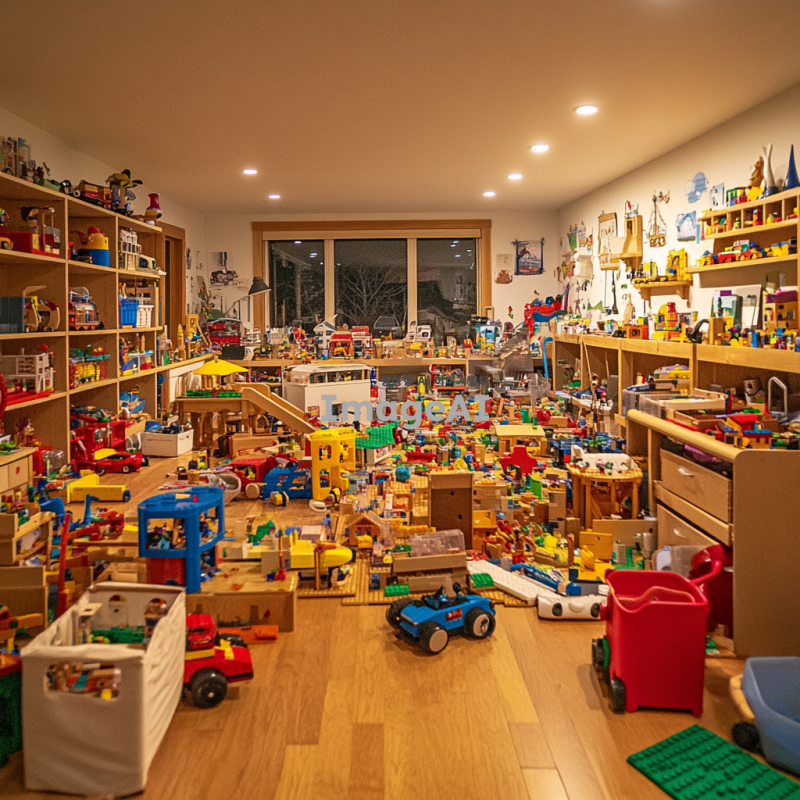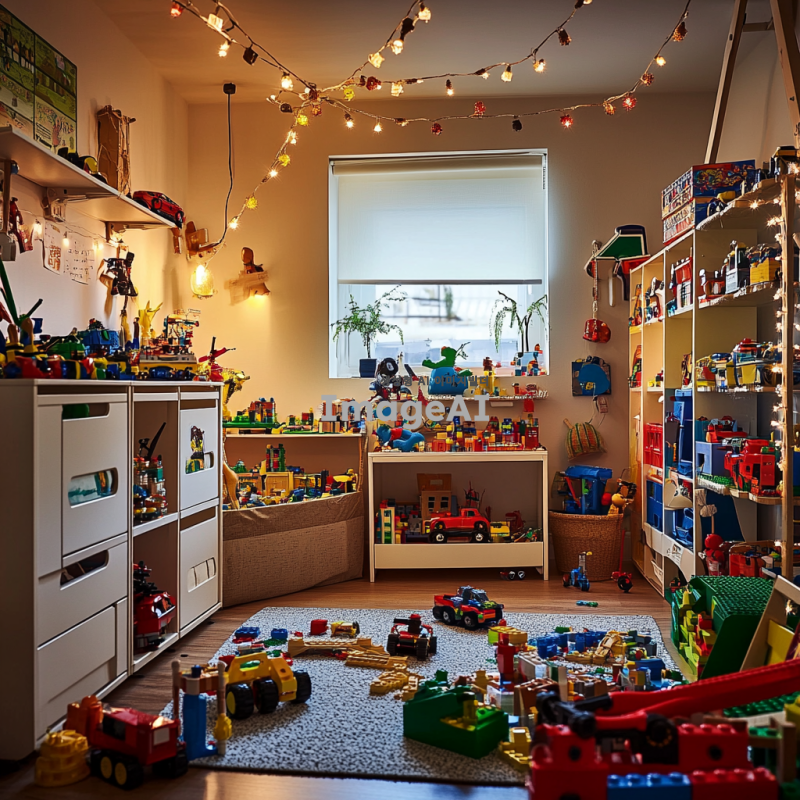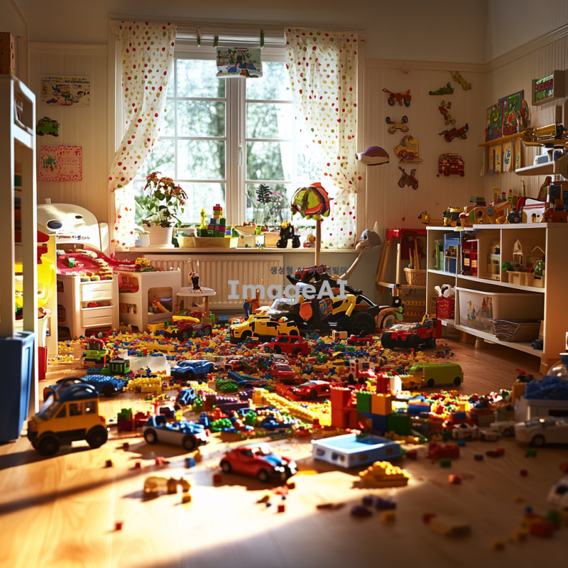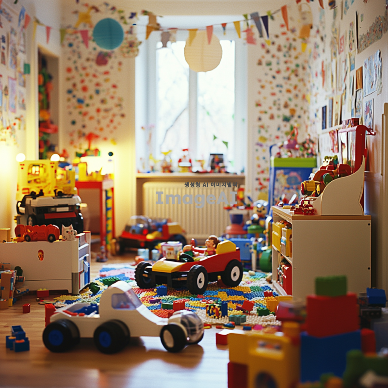화사하고 자유로운 조명이 비치는 놀이방, 6~7살 아이들이 좋아할 만한 RC카, 나무 블록 장난감, 레고 등이 널부러져 있는 모습. 밝고 아기자기한 색상으로 꾸며진 방, 아이들이 즐겁게 놀고 있는 분위기. 다양한 장난감들이 어지럽게 놓여 있어 생동감 넘치는 장면.