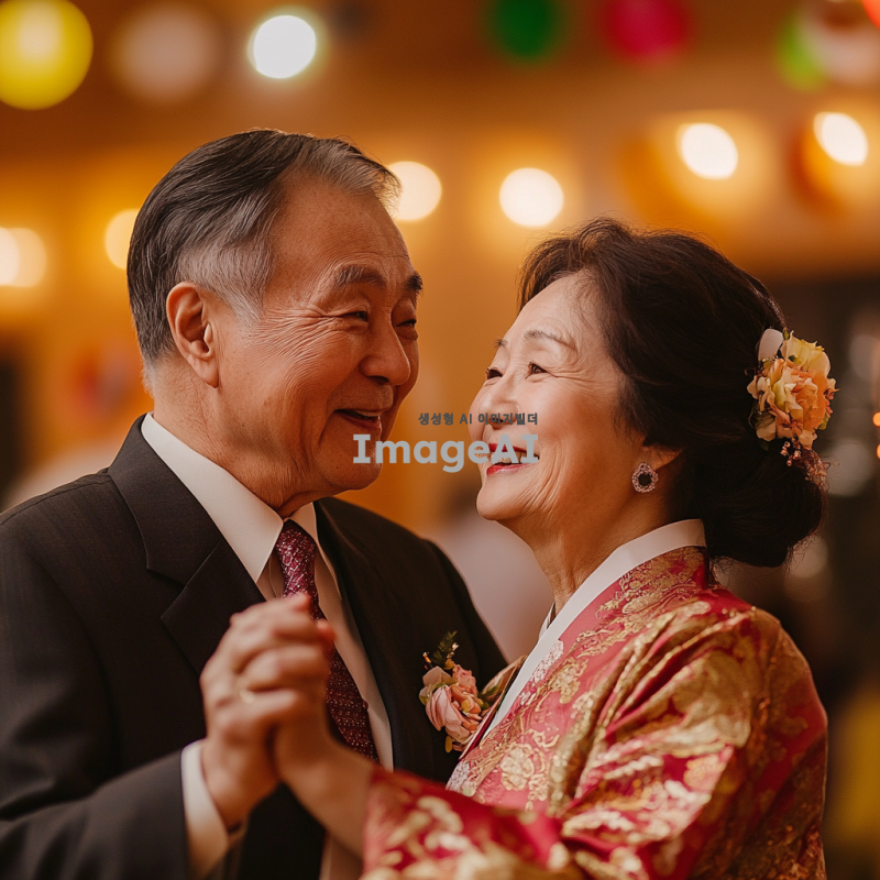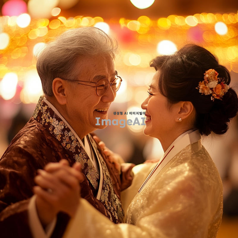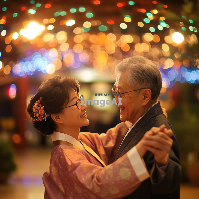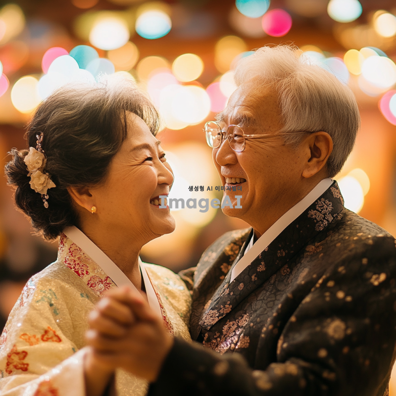 할아버지와 할머니가 함께 신나게 춤추고 있는 모습, 따뜻한 색감의 실내에서 즐거운 표정을 지으며 서로를 바라보는 모습, 전통적인 한국의 의상을 입고 있는 모습, 주변에는 화려한 조명이 비추고 있는 장면, 행복한 분위기와 사랑이 가득한 순간을 포착한 이미지