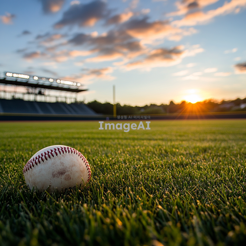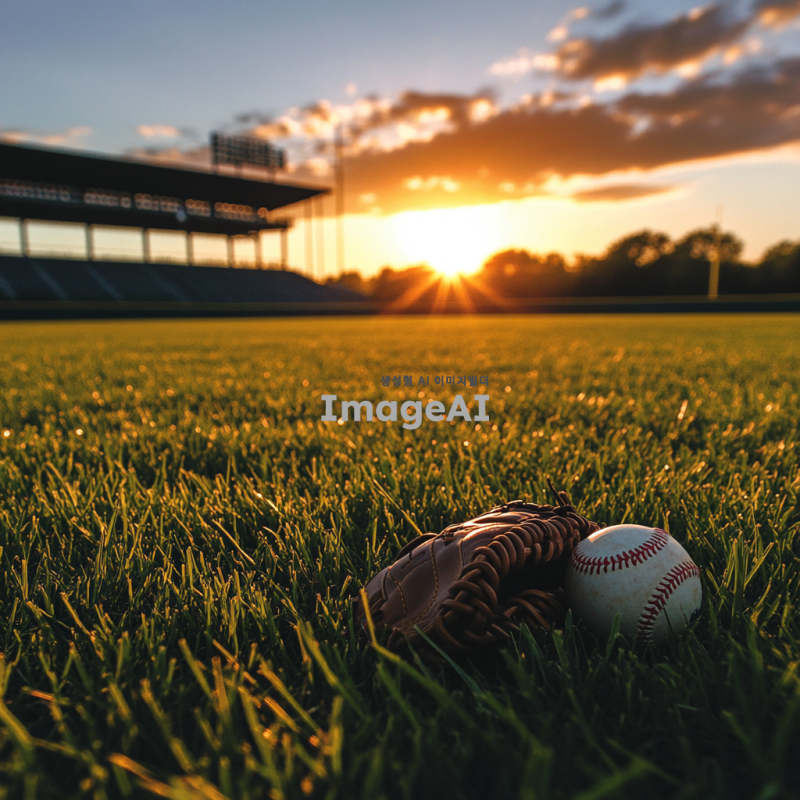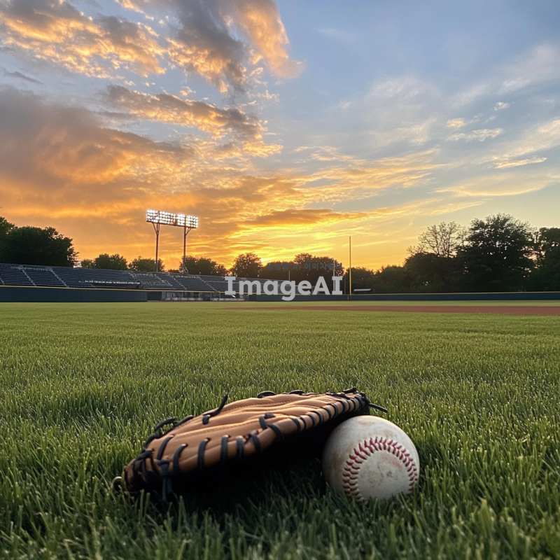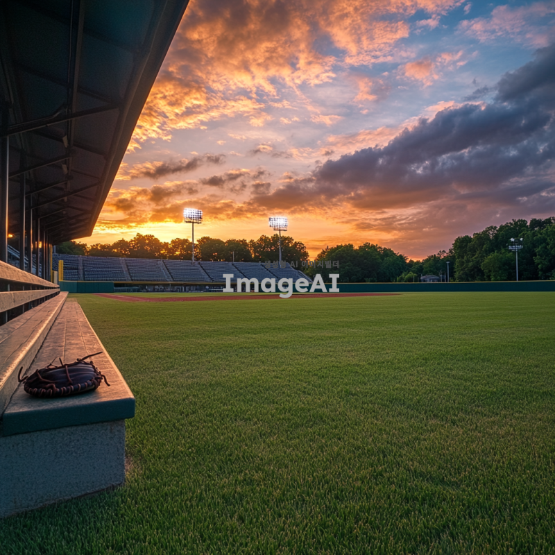 조용한 야구장, 빈 관중석, 잔디가 잘 관리된 필드, 저녁 노을이 지는 하늘, 고요한 분위기, 야구 글러브와 공이 놓인 dugout, 먼 배경에 있는 구경꾼 없는 관람석, 평화로운 느낌, 자연의 소리가 들리는 정적한 순간