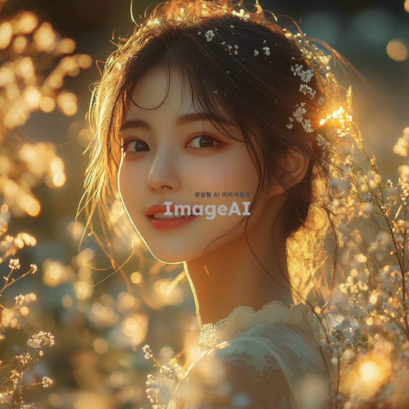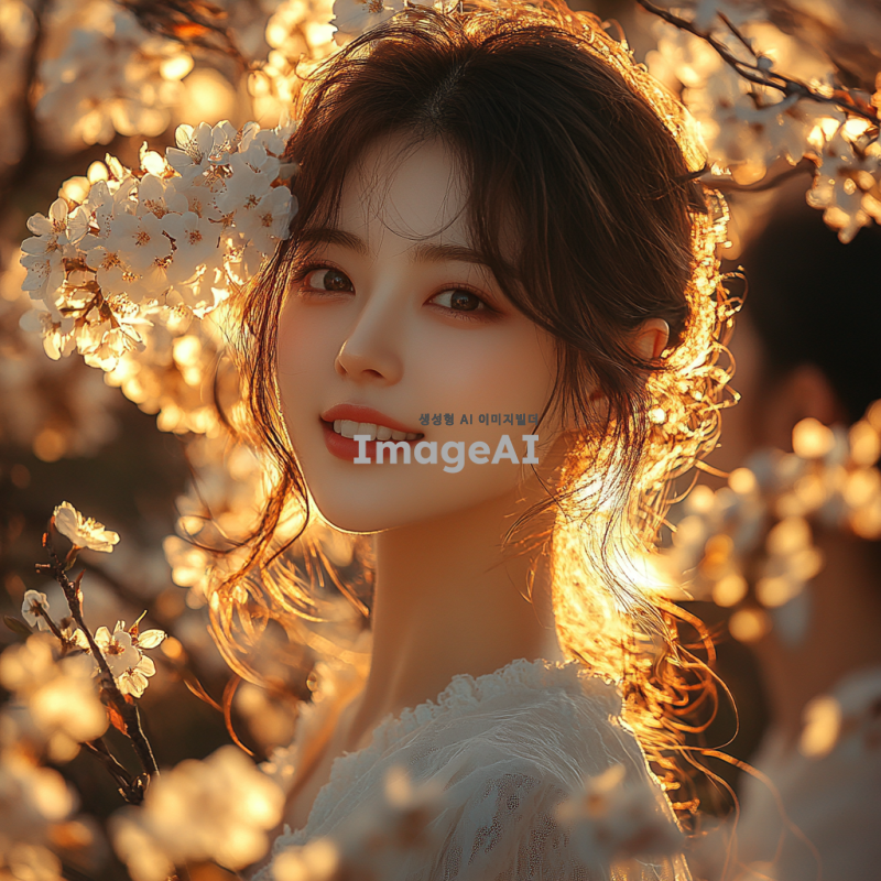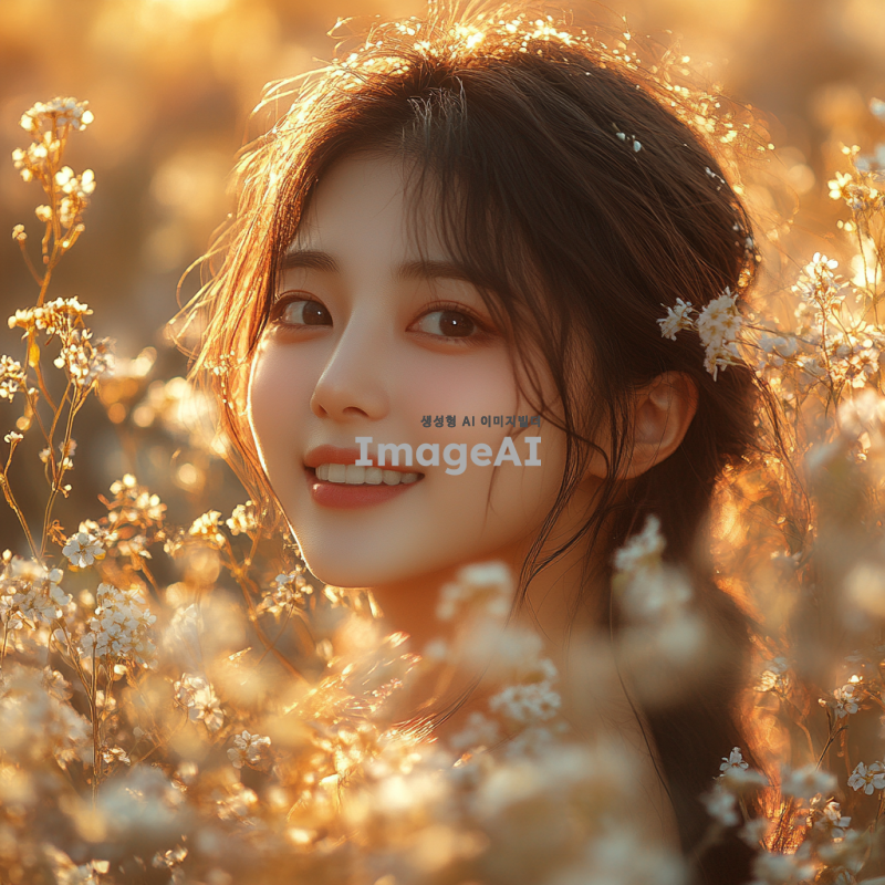 환한 새벽 햇살 아래에서 미소 짓고 있는 한국인 여성의 모습, 주변에는 부드러운 꽃들이 만발해 있고, 따뜻한 빛이 그녀의 얼굴을 감싸고 있는 장면. 그녀의 눈빛은 사랑스럽고, 주변 사람들은 그녀를 바라보며 감탄하는 모습, 전체적으로 따뜻하고 포근한 분위기.