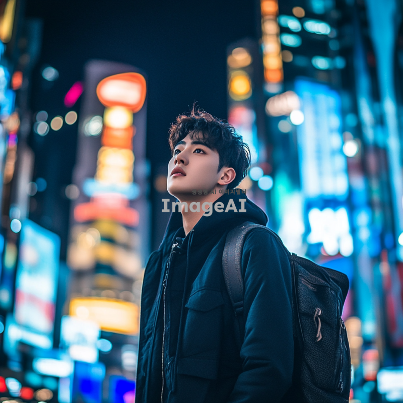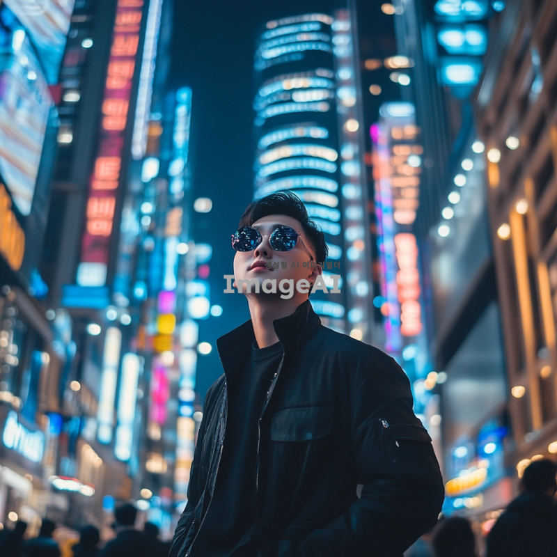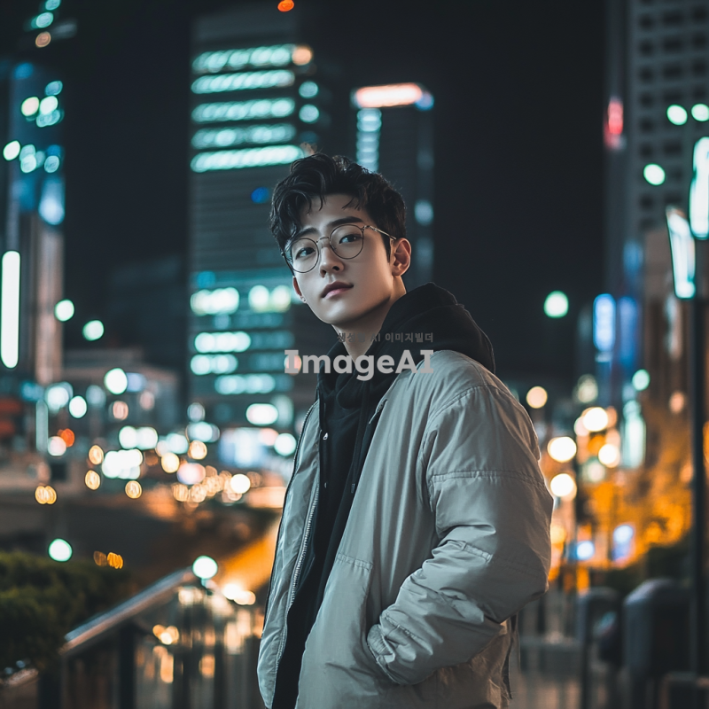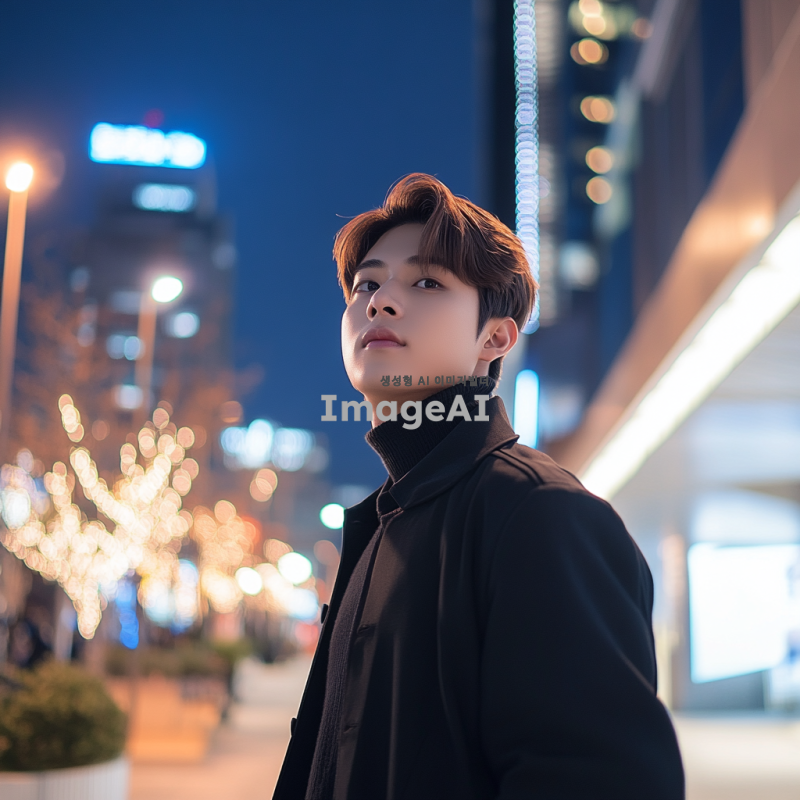 한국의 젊은 남성이 세련된 패션을 입고 자신감 넘치는 포즈를 취하고 있는 모습, 배경은 도시의 현대적인 풍경으로, 화려한 조명과 고층 건물이 어우러져 있어 시선을 끌게 함. 그의 표정은 매력적이고 카리스마가 넘치며, 주변 사람들의 시선이 그에게 집중되고 있는 장면.