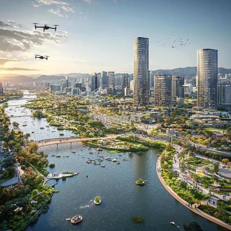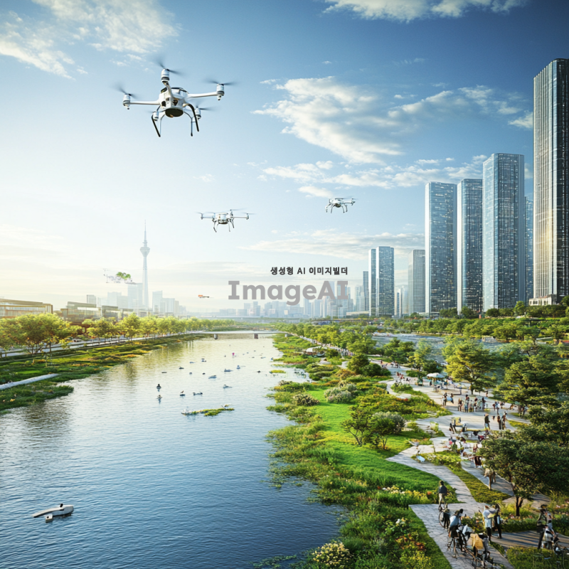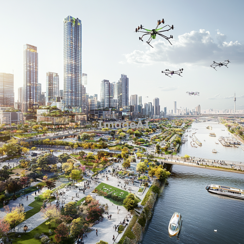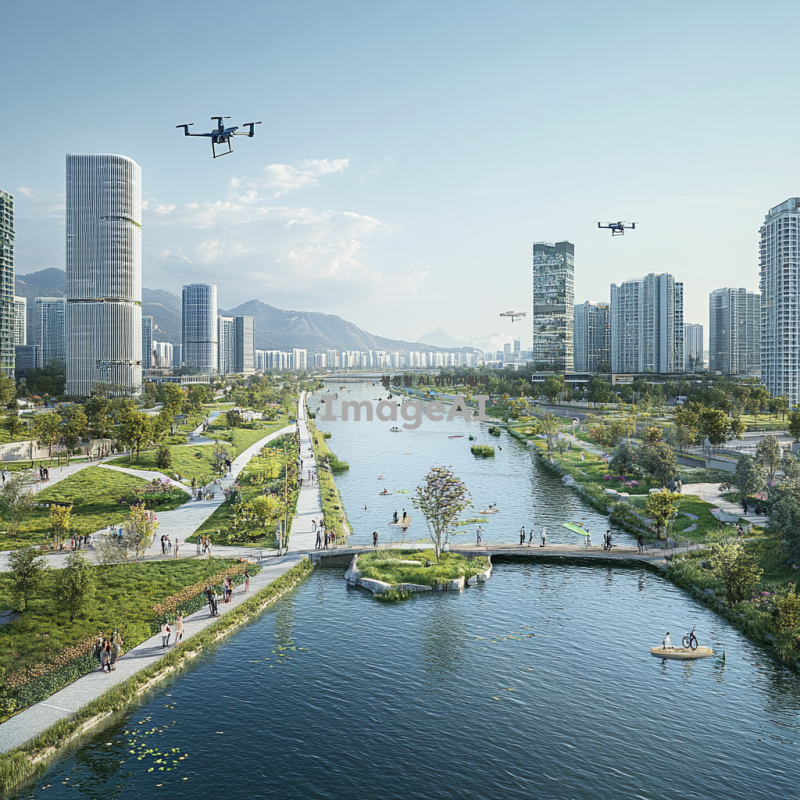 2030년의 한강, 미래적인 도시 풍경과 함께 흐르는 강, 현대적인 건축물과 녹지 공간이 조화를 이루는 모습, 사람들은 다양한 여가 활동을 즐기고 있으며, 자전거 도로와 산책로가 잘 정비되어 있는 모습, 하늘에는 드론이 날아다니고, 강변에는 세련된 카페와 레스토랑이 줄지어 있는 장면.