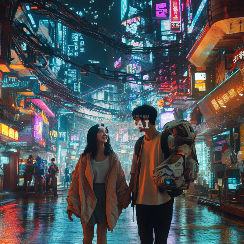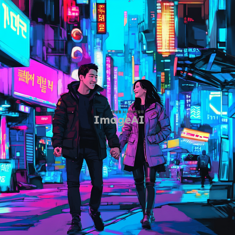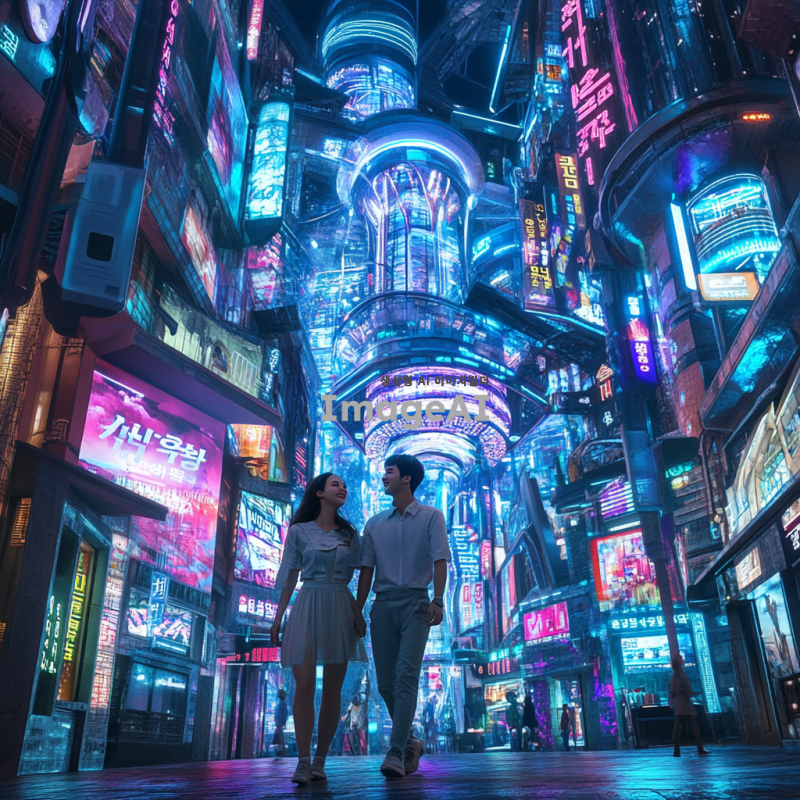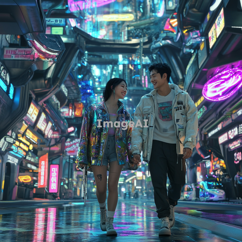 2025년의 미래 도시에서 한국인 남성이 여자친구와 함께 걷고 있는 모습, 현대적인 건축물과 화려한 네온사인이 어우러진 배경, 두 사람은 서로를 바라보며 미소짓고 있고, 미래적인 패션을 입고 있으며, 주변에는 다양한 미래 기술이 적용된 장면들이 보이는 모습.