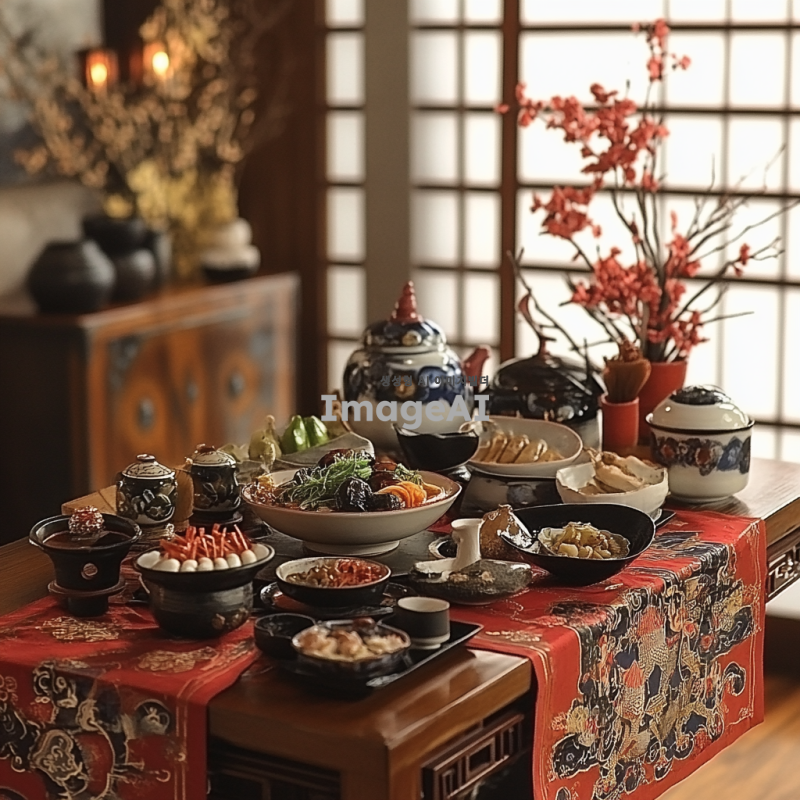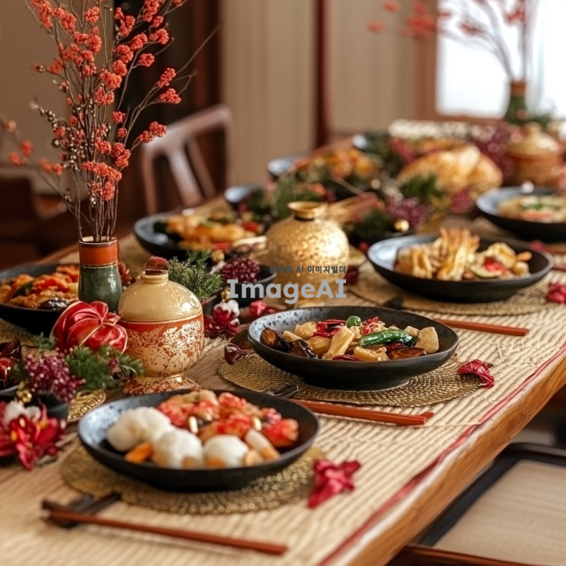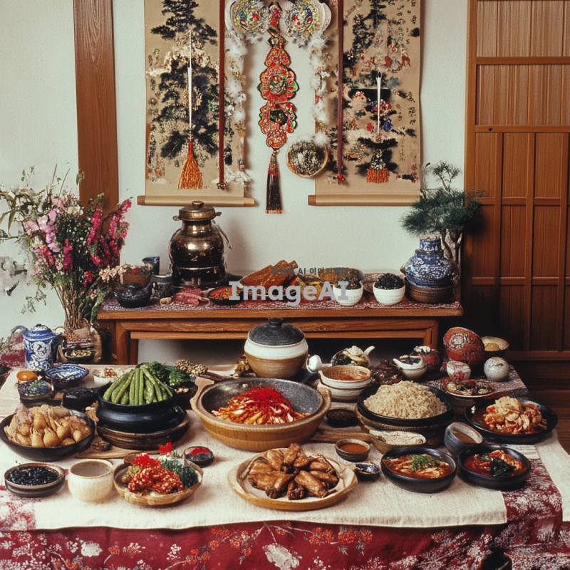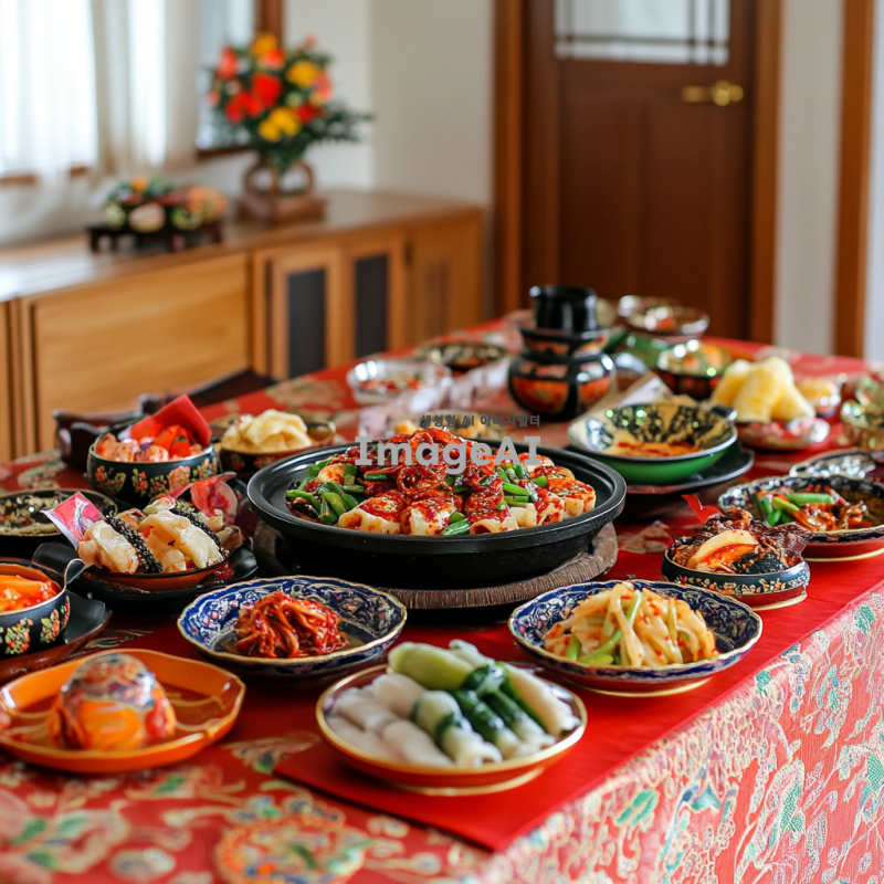 한국의 전통적인 식기와 장식으로 꾸며진 테이블.