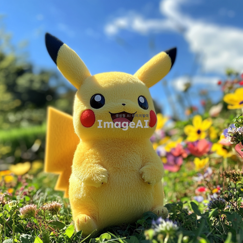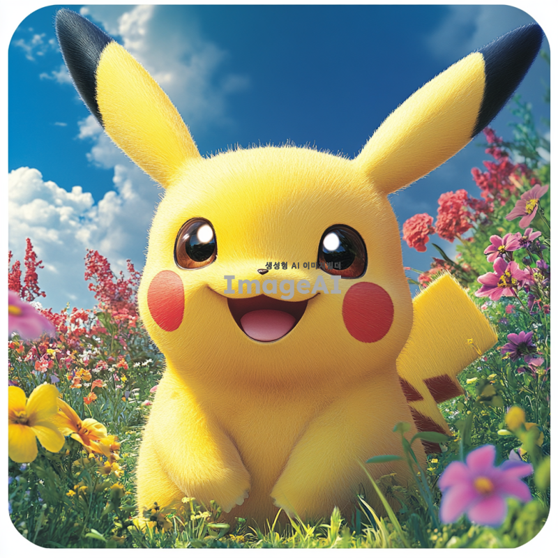 귀여운 피카츄가 푸른 풀밭 위에서 햇살을 받으며 웃고 있는 모습, 배경에는 화사한 꽃들과 파란 하늘이 어우러져 있는 장면, 피카츄의 특징적인 노란색 털과 큰 귀, 그리고 반짝이는 눈이 강조된 이미지.