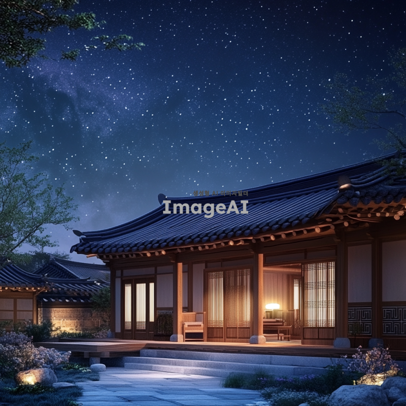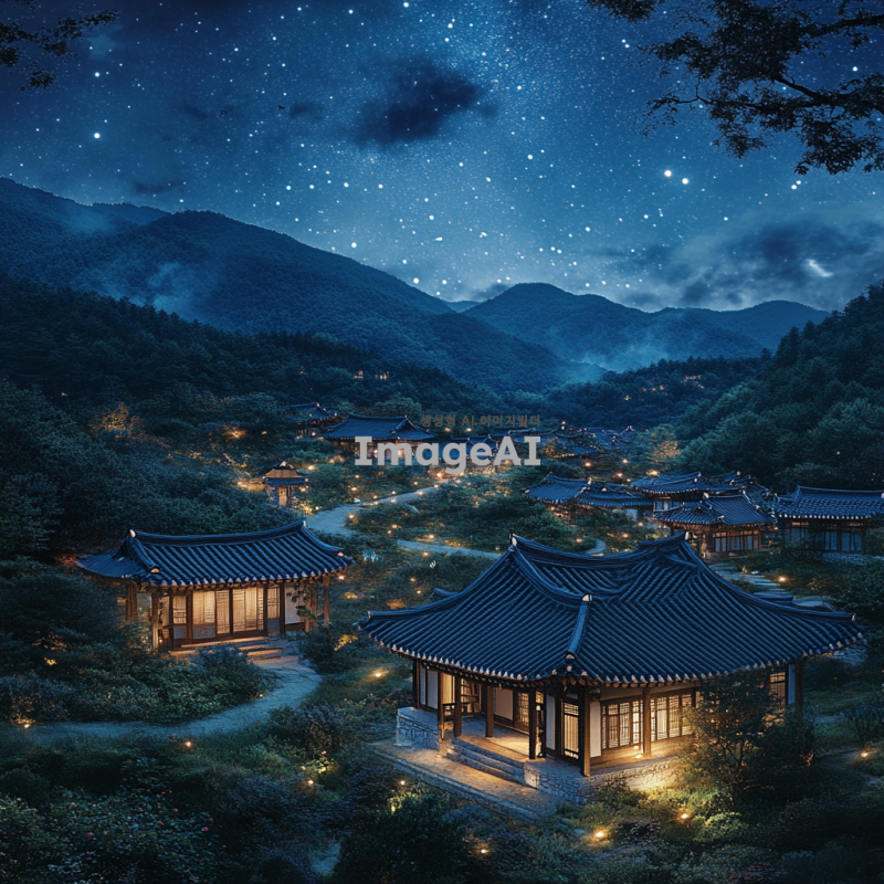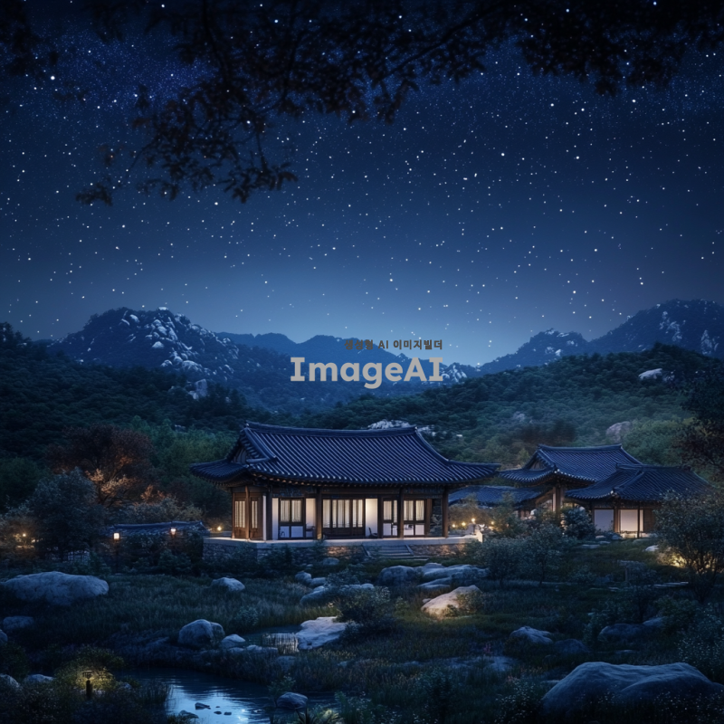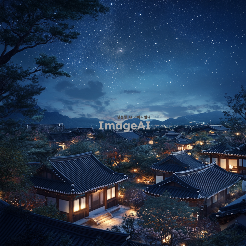별이 많은 밤하늘 아래 조선의 전통적인 풍경, 고즈넉한 한옥과 아름다운 자연이 어우러진 모습, 은은한 달빛이 비추는 고요한 분위기, 별빛이 반짝이는 하늘과 함께 조선 시대의 정취가 느껴지는 장면.