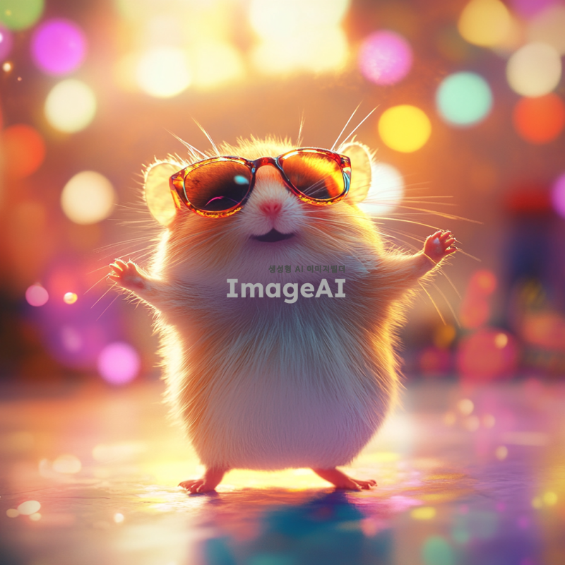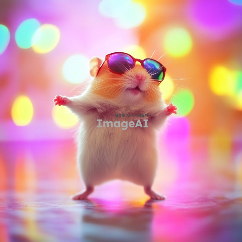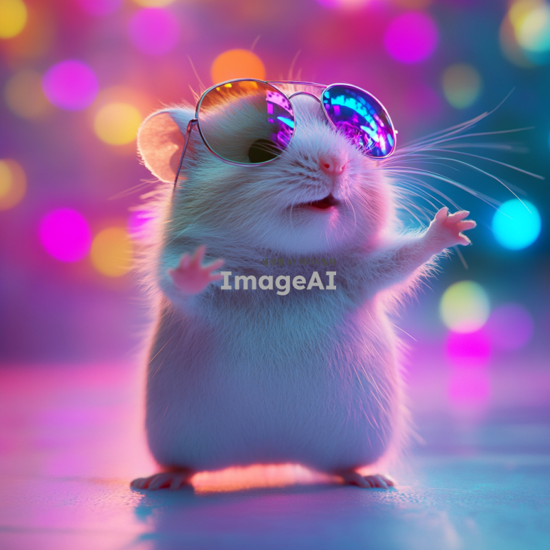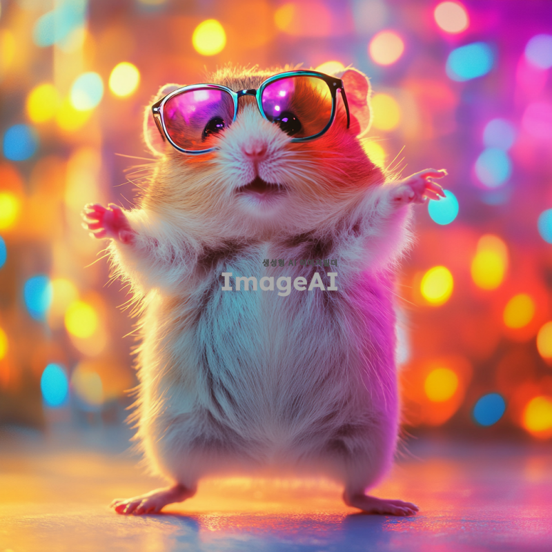 햄스터가 선글라스를 끼고 신나게 춤추고 있는 모습, 밝고 경쾌한 배경, 햄스터의 귀여운 표정과 역동적인 포즈, 다양한 색상의 조명 효과, 행복한 분위기, 재미있는 디테일 강조