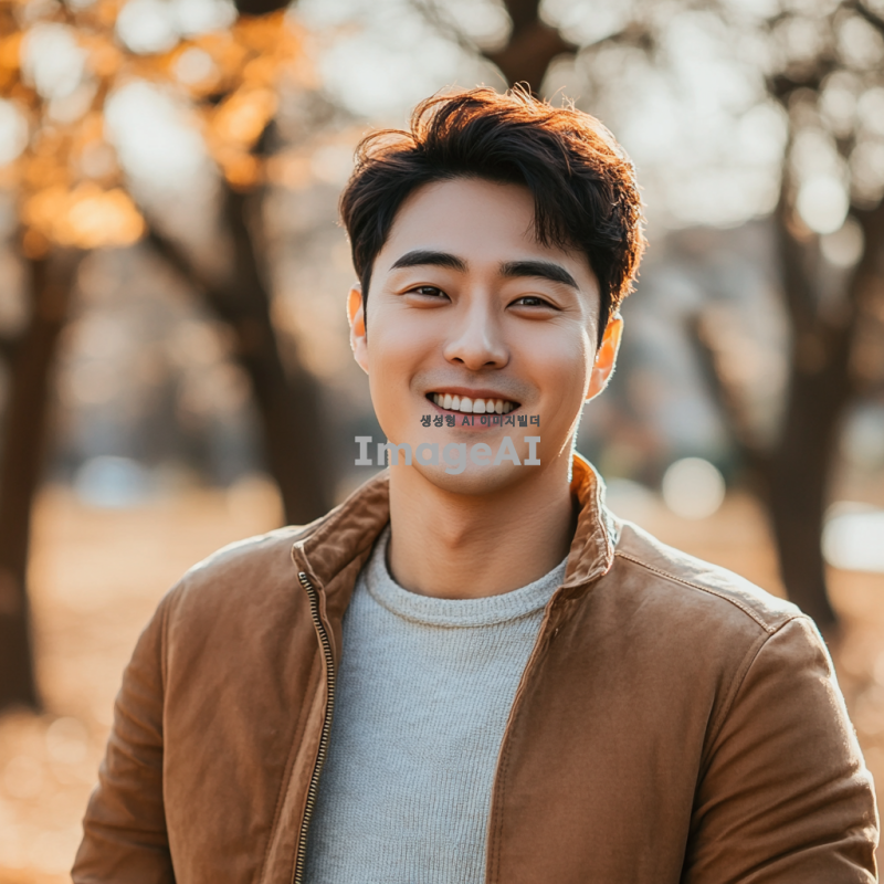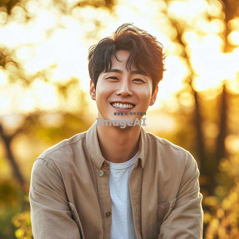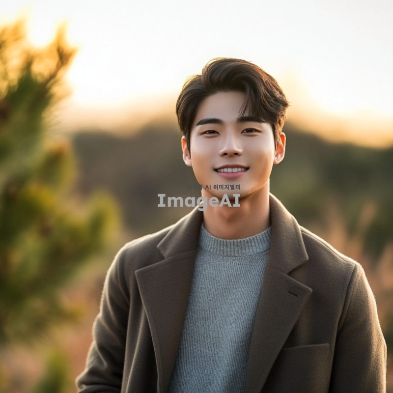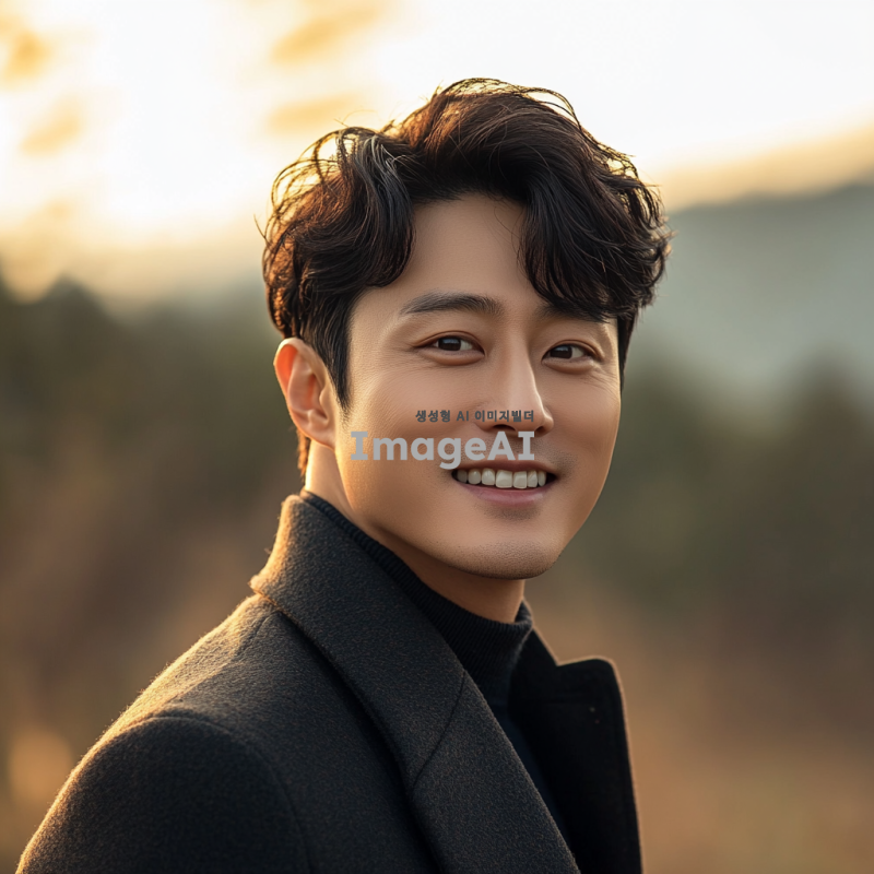 잘생기고 착한 한국 남성의 초상화, 매력적인 외모와 따뜻한 미소를 가진 인물, 세련된 패션과 자신감 넘치는 포즈, 배경은 자연 풍경으로 부드러운 빛이 비추는 장면, 현대적인 느낌을 주는 색감, 친근하고 신뢰감 있는 분위기.