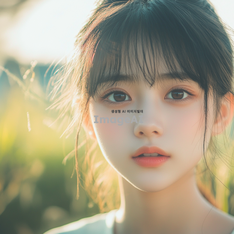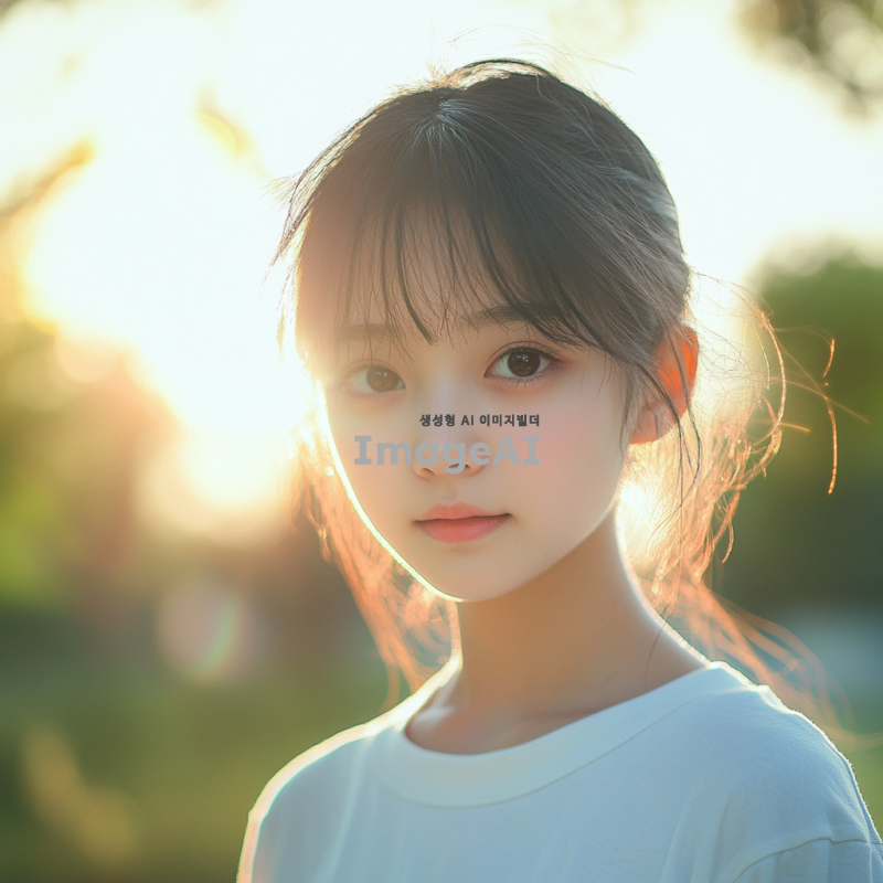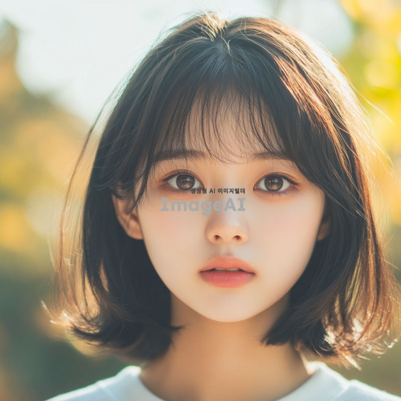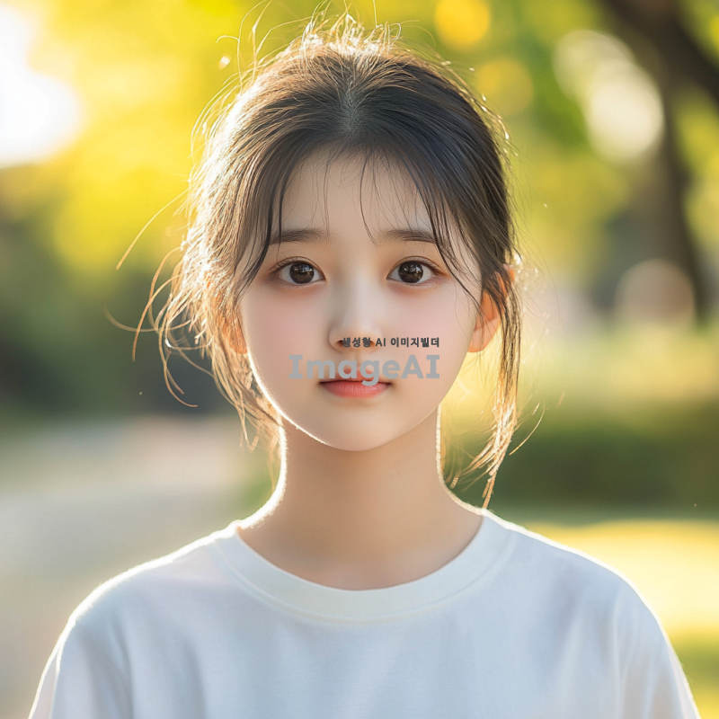 14살 한국인 소녀, 작은 얼굴, 쌍꺼풀 있는 큰 눈, 앞머리 없는 스타일, 부드러운 표정, 자연광 아래, 캐주얼한 의상, 배경은 화창한 공원, 생기 넘치는 분위기