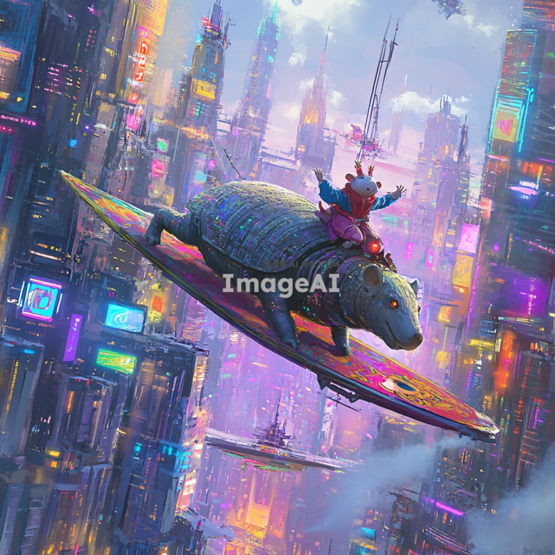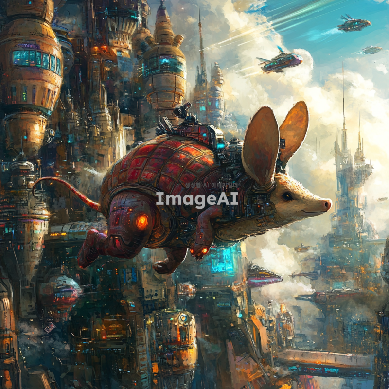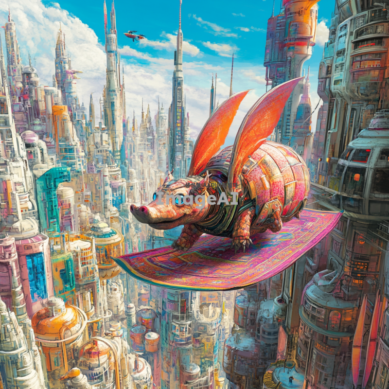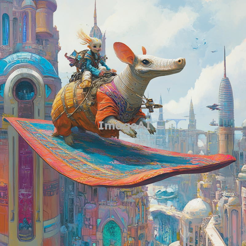 미래의 도시 배경, 미래적인 건축물들이 가득한 거리, 알라딘의 마법 양탄자를 타고 하늘을 나는 아르마딜로, 밝고 생동감 넘치는 색감, 환상적인 분위기, 아르마딜로의 표정은 호기심 가득, 날아다니는 모습이 역동적이고 자유로운 느낌을 주는 장면.