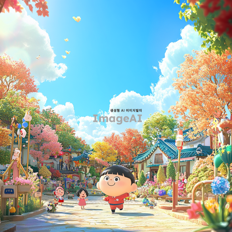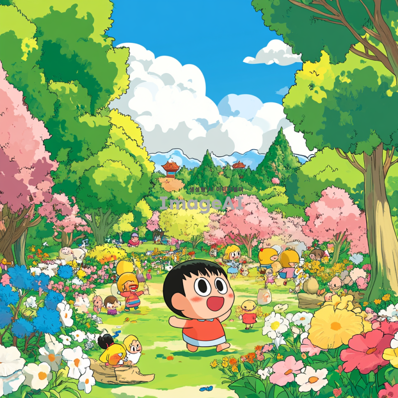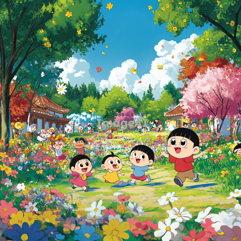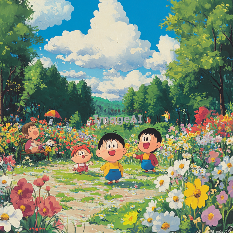 짱구 캐릭터가 공원에서 친구들과 함께 놀고 있는 모습, 화창한 날씨, 다양한 나무와 꽃들이 있는 배경, 짱구 특유의 장난꾸러기 표정, 친구들과의 즐거운 상호작용, 만화 스타일의 밝고 생동감 있는 색감, 한국적인 요소가 가미된 풍경.