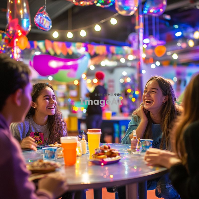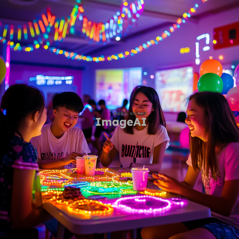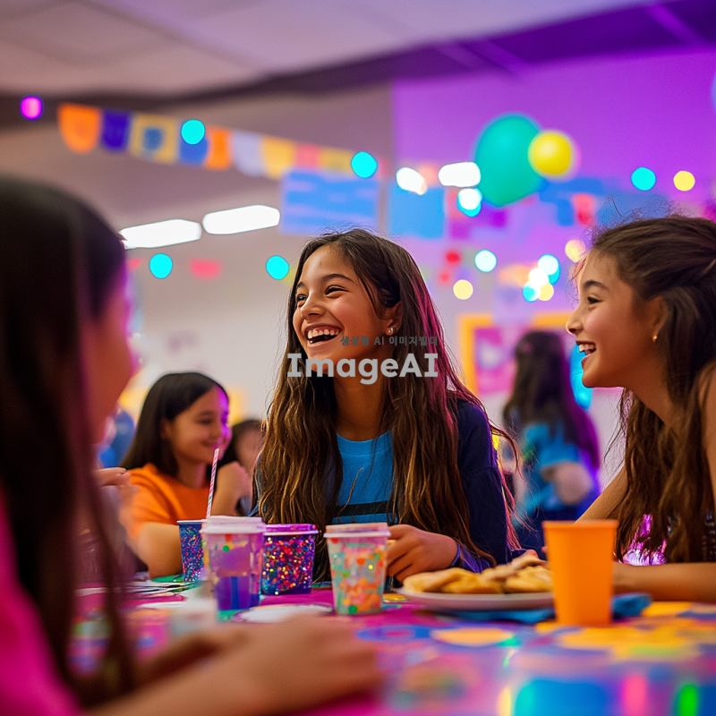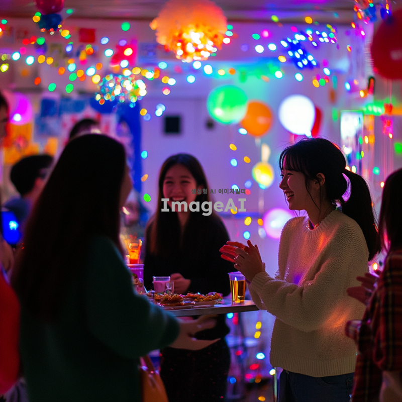 중학교 1학년 7반의 멋진 파티 장면, 화려한 조명과 장식으로 꾸며진 실내 공간, 친구들이 즐겁게 대화하고 웃고 있는 모습, 다채로운 색상의 조명이 반짝이며 분위기를 밝게 만들어주는 모습, 테이블에는 간단한 간식과 음료가 놓여있고, 배경에는 풍선과 현수막이 장식된 파티 공간.