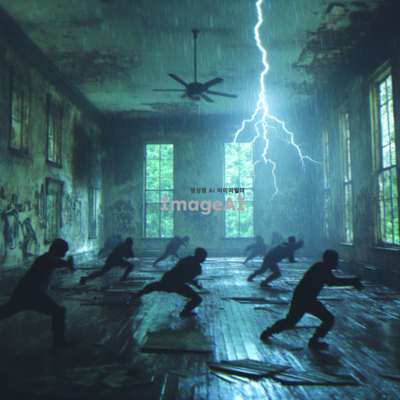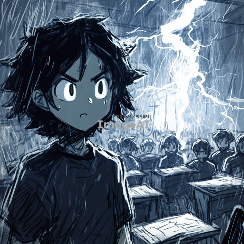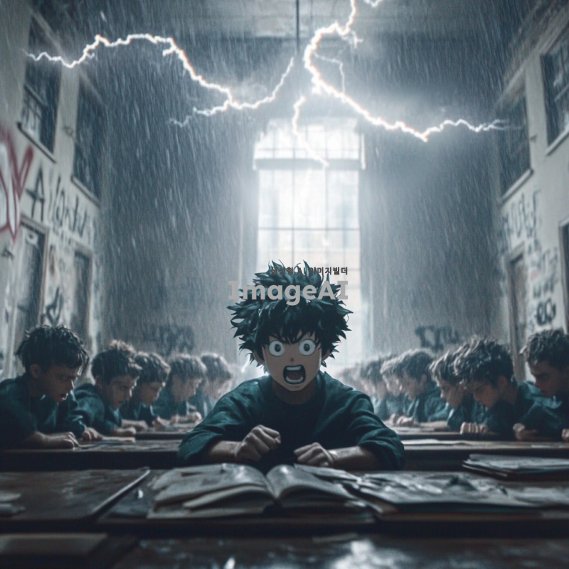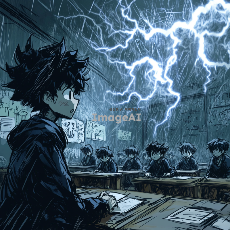 어두운 교실에서 긴장감이 감도는 1-7반 학생들이 서로 대치하고 있는 모습. 학생들은 격렬한 싸움 준비 자세를 취하고 있으며, 표정은 결연하고 두려움이 섞여 있다. 교실의 조명은 어둡고 음산한 분위기를 자아내며, 벽에는 낙서와 함께 싸움의 흔적이 남아 있다. 창문 밖으로는 폭풍우가 몰아치고, 번개가 치며 불길한 분위기를 더하고 있다.