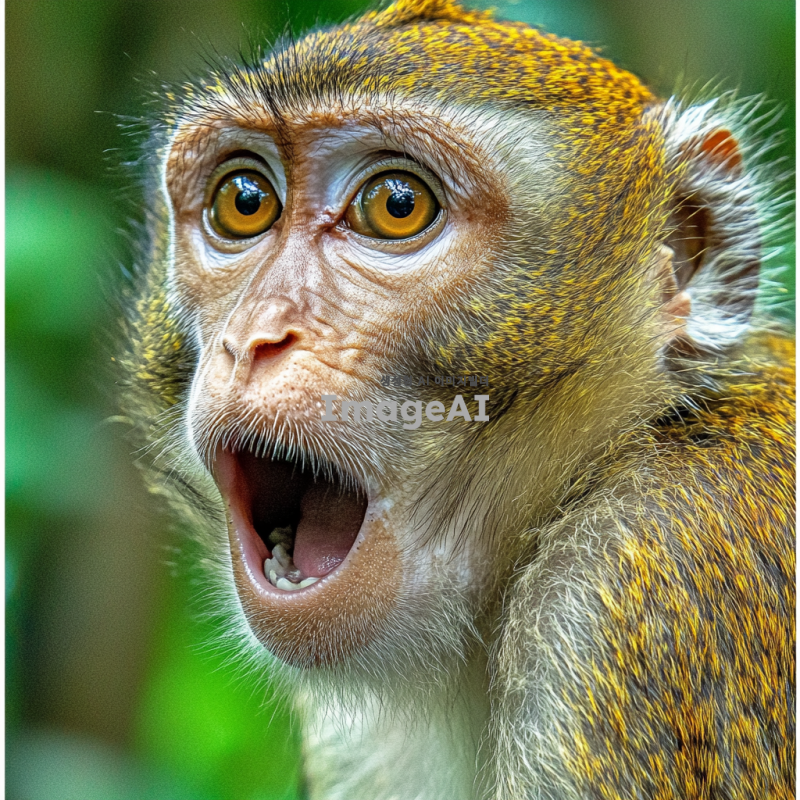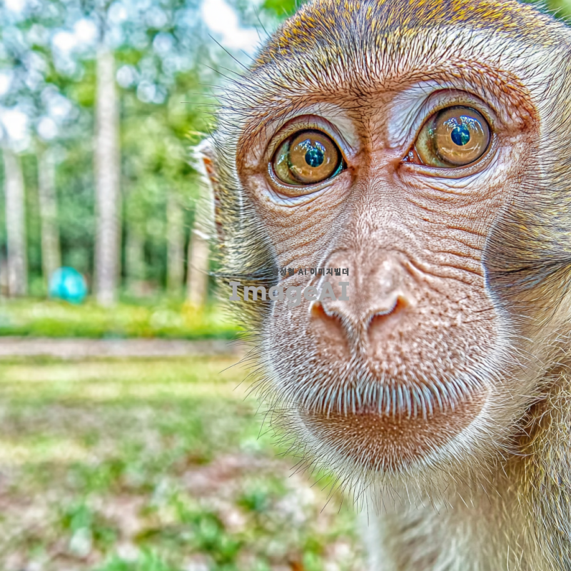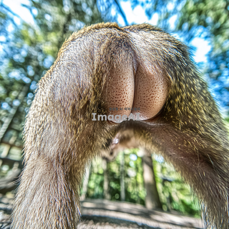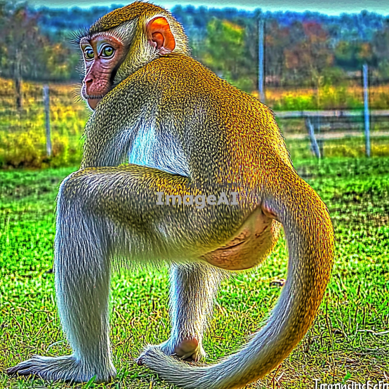 원숭이의 엉덩이를 클로즈업으로 촬영한 이미지, 자연 속에서 즐거운 표정을 짓고 있는 원숭이, 생동감 넘치는 색감과 디테일, 밝고 경쾌한 분위기, 배경은 푸른 숲과 나무들로 둘러싸여 있는 모습