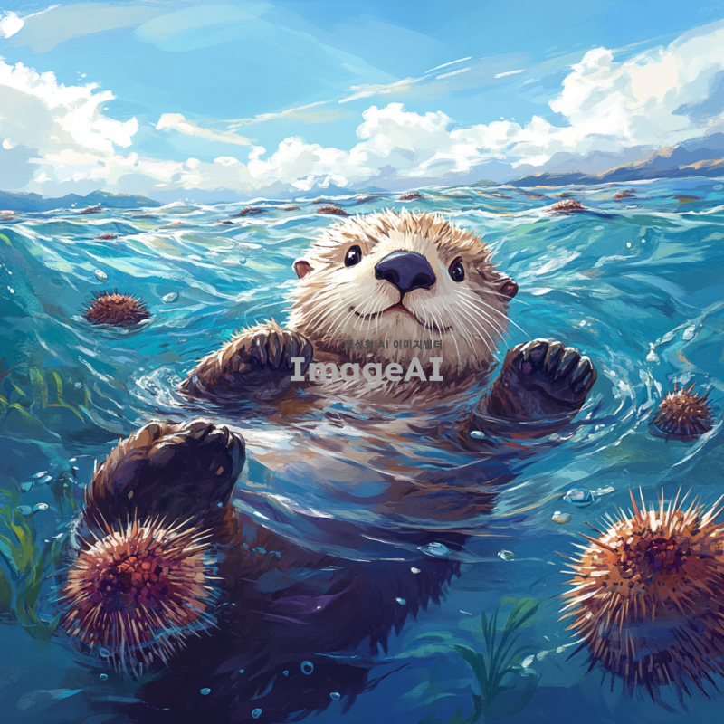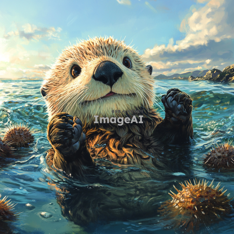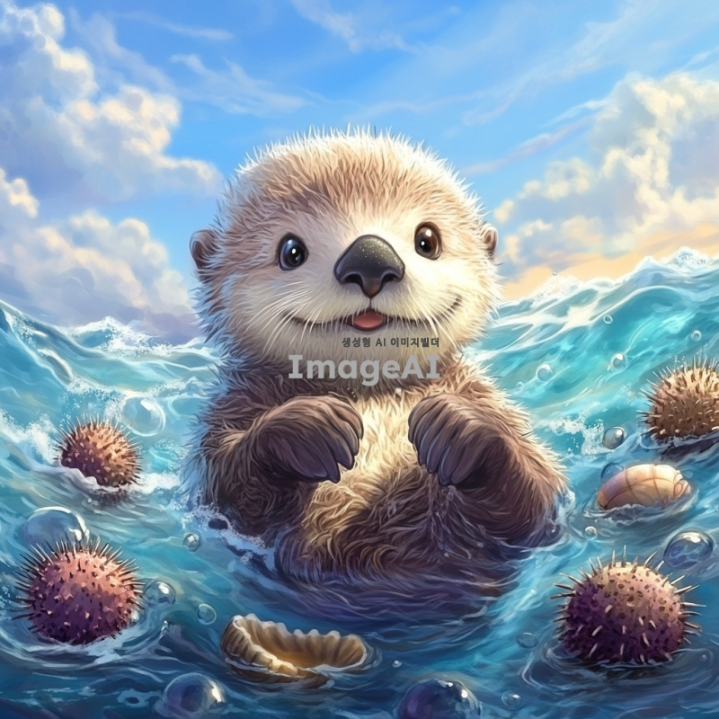 귀여운 해달이 바다 위에 떠 있는 모습 맑은 바다와 푸른 하늘, 해달의 부드러운 털과 큰 눈, 주변에 바다소라와 조개가 흩어져 있는 풍경, 따뜻한 햇살 아래 해달이 웃고 있는 모습.