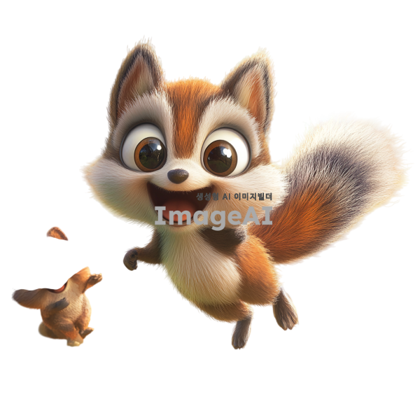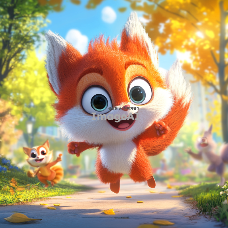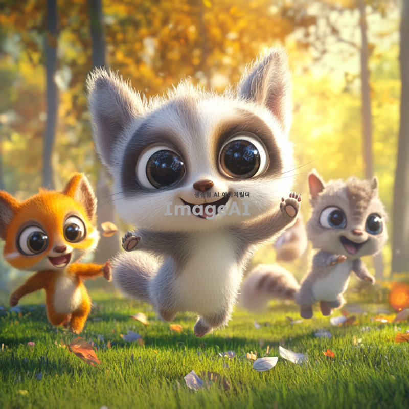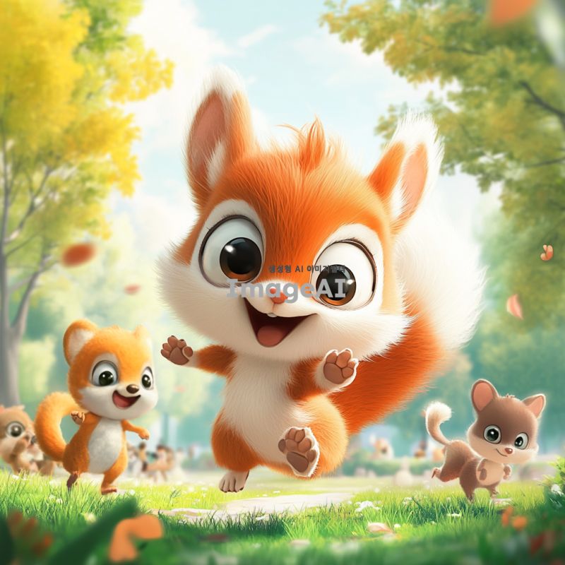 귀여운 개그 동물 캐릭터, 큰 눈과 웃는 표정, 다양한 색상의 털, 재밌는 포즈로 뛰어다니는 모습, 배경은 아기자기한 공원, 다른 동물 친구들과 함께 놀고 있는 장면, 만화 스타일, 밝고 경쾌한 분위기