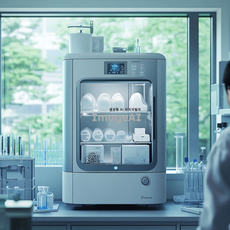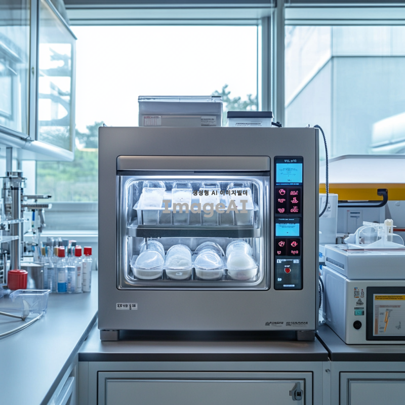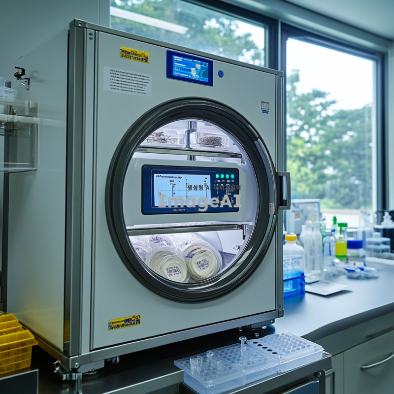 실험실 환경에서 사용되는 동결건조기를 배경으로 한 이미지. 동결건조기 내부에는 다양한 샘플이 진열되어 있고, 기계의 전면에는 디지털 디스플레이가 켜져 있다. 실험실은 현대적이고 깨끗한 느낌으로, 금속과 유리 재질이 조화를 이루고 있다. 주변에는 실험 도구와 화학 물질이 정돈되어 있으며, 자연광이 들어오는 창문이 있어 환한 분위기를 연출한다. 한국인 연구원이 동결건조기를 조작하고 있는 모습이 포함되어 있다.