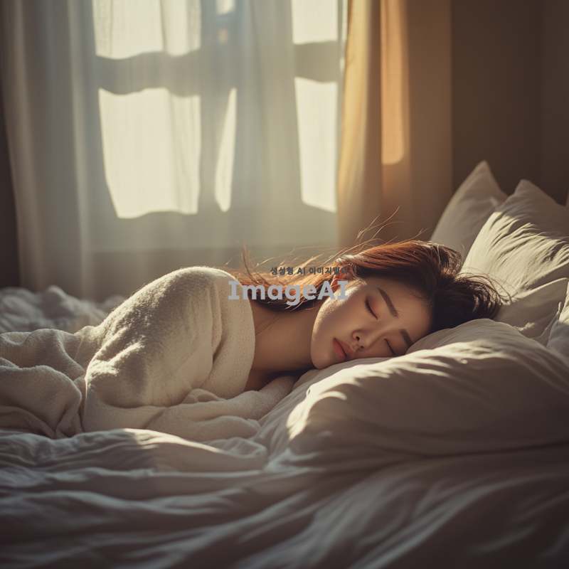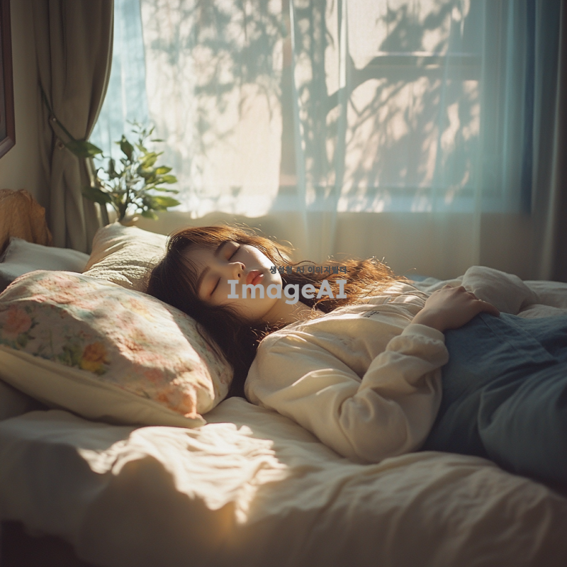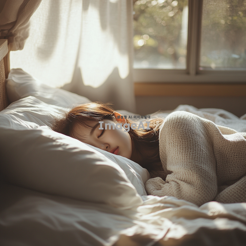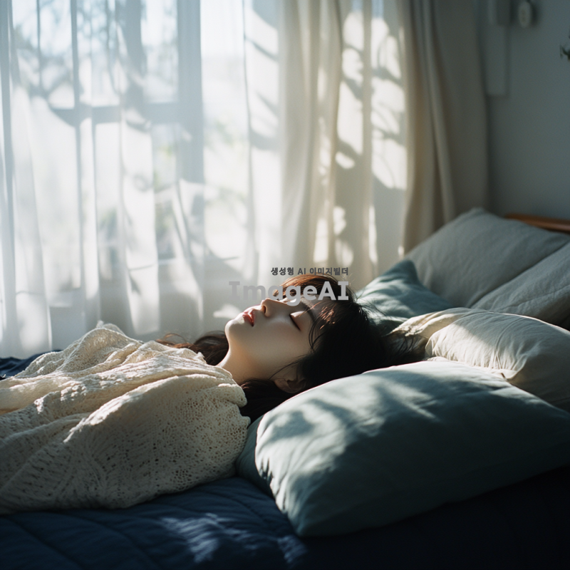 침대에 옆으로 외롭게 누워있는 한국인 여성, 부드러운 조명 아래에서 감정이 드러나는 표정, 방 안은 아늑하고 따뜻한 분위기, 침대 위에는 부드러운 이불과 몇 개의 베개가 놓여 있음, 창밖으로 부드러운 햇살이 들어오는 모습, 미디엄 샷