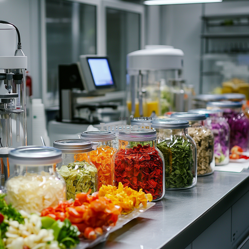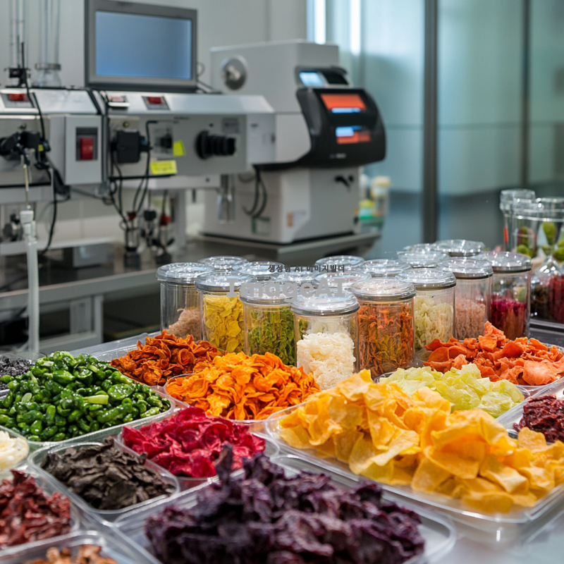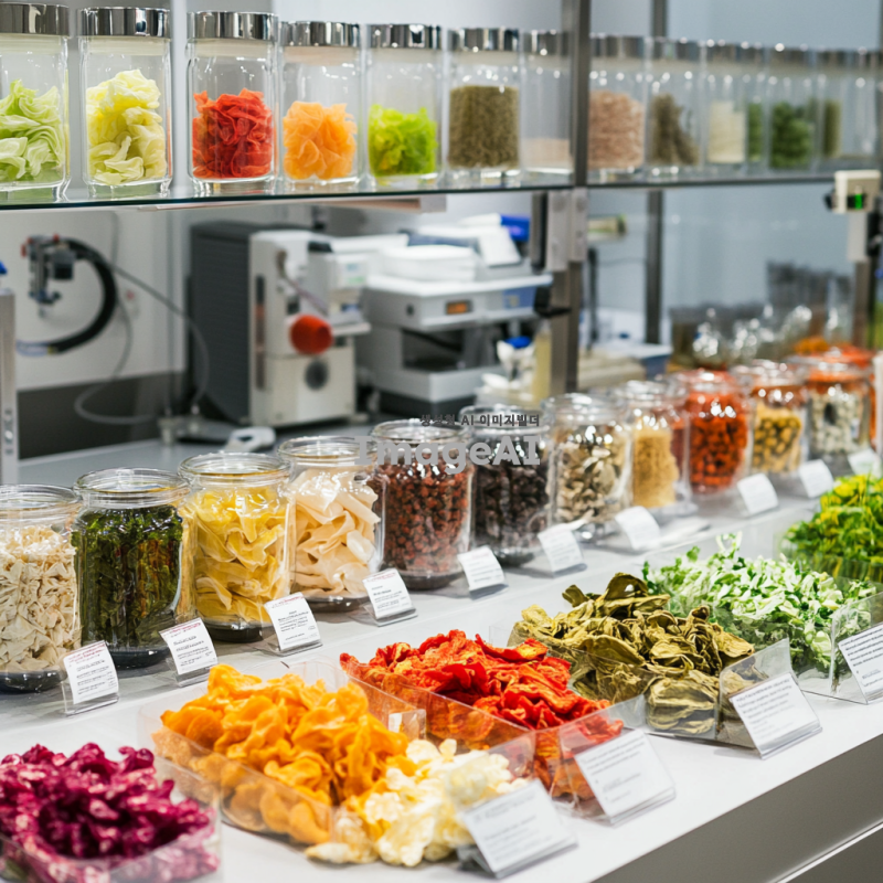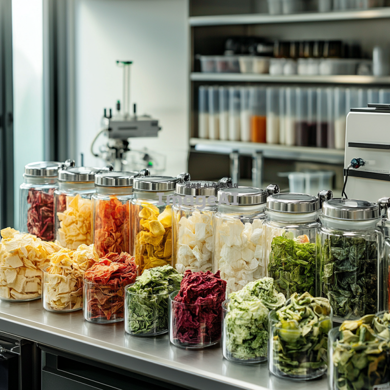 실험실 환경에서 동결건조된 다양한 야채들이 정리된 모습, 깨끗하고 현대적인 실험실 배경, 야채들은 색상이 선명하고 형태가 잘 보존되어 있으며, 실험 장비와 함께 배치되어 있는 장면, 과학적인 분위기 강조.
