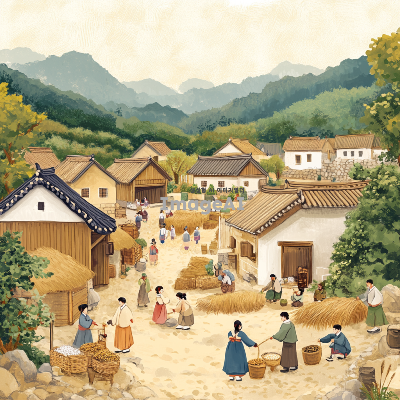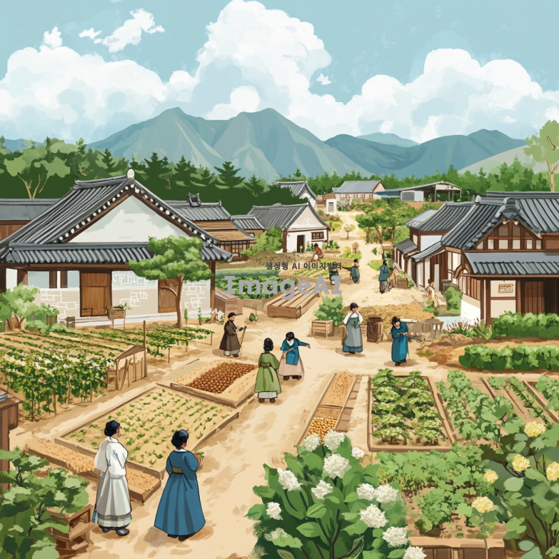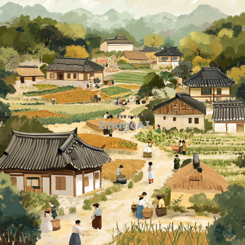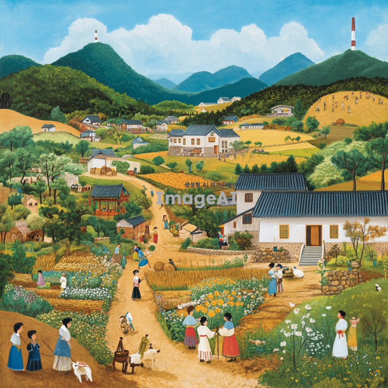 남진 정책을 주제로 한 그림을 그려줘. 20세기 중반의 한국 배경, 남진 정책을 상징하는 요소들(예: 농촌, 산업화, 도시화), 한국 전통 의상을 입은 사람들이 농사짓거나 산업 시설에서 일하는 모습, 평화로운 분위기와 미래 지향적인 느낌을 강조.