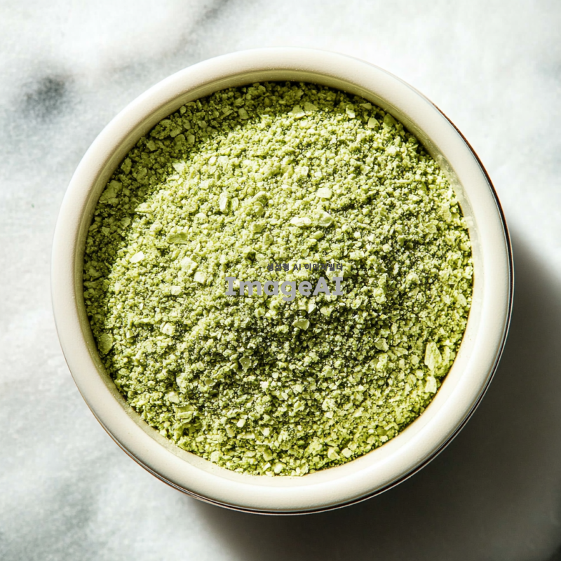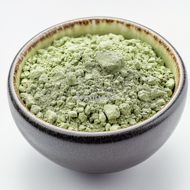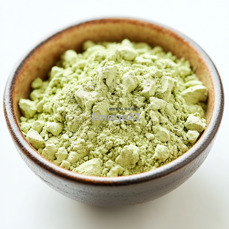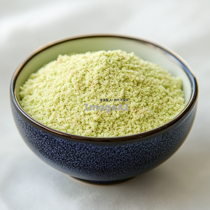 볼에 담긴 동결건조된 양배추분말, 자연광 아래에서 촬영된 모습, 부드러운 텍스처와 선명한 색감, 배경은 깨끗하고 단순하게, 건강하고 신선한 느낌을 강조한 이미지.