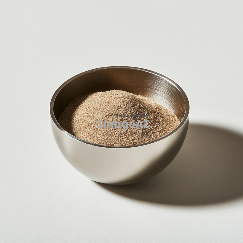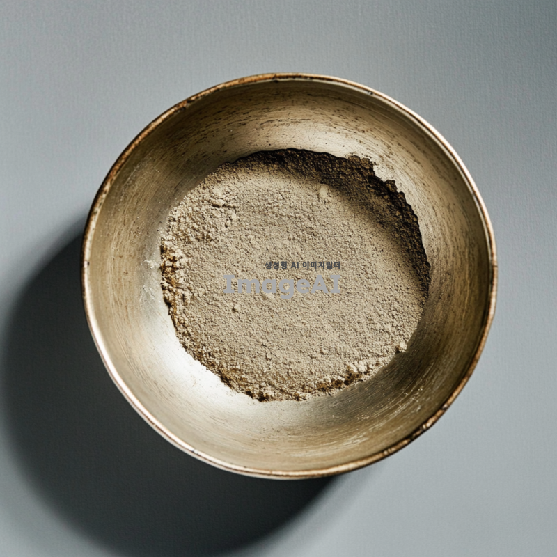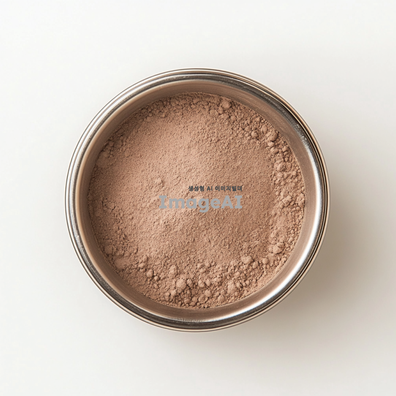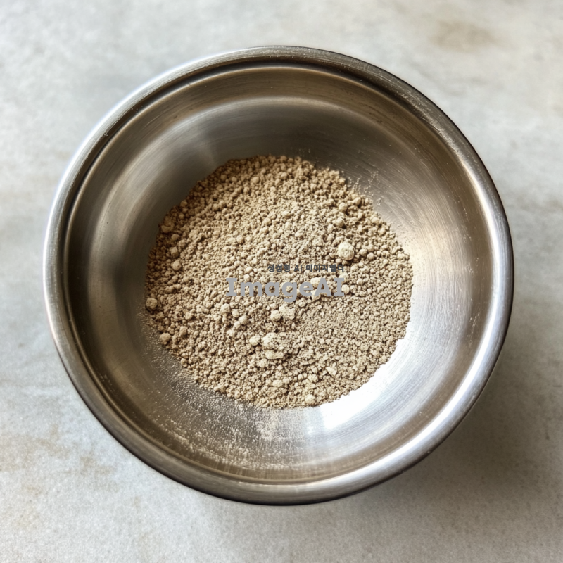 스텐볼에 담긴 동결건조된 표고버섯분말, 자연광 아래에서 촬영된 모습, 부드러운 질감과 고운 입자가 잘 보이도록, 배경은 깔끔하고 심플하게, 자연적인 색감이 강조되도록.