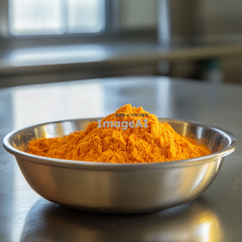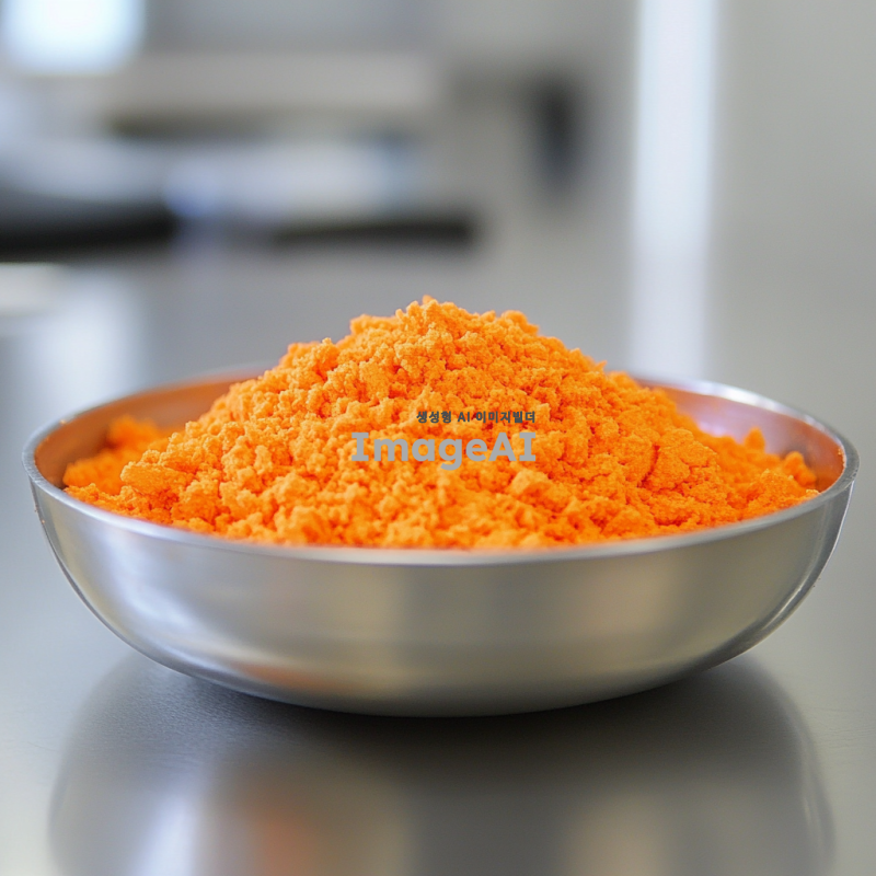 실험실 환경에서 스텐볼에 담긴 동결건조된 당근분말의 세밀한 모습, 배경은 깨끗한 실험실 테이블, 조명이 밝고 과학적인 느낌을 주며, 당근분말의 질감과 색상이 잘 드러나도록.