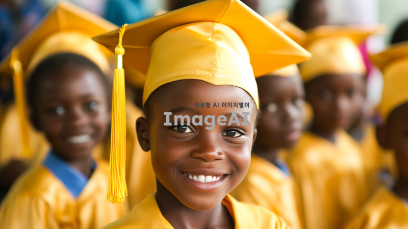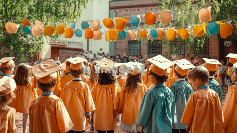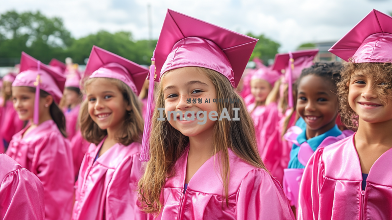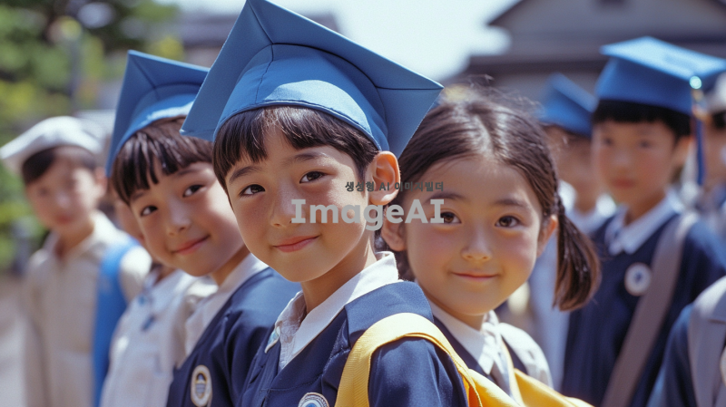 졸업식날 옹기종기 모여있는 초등학생 아이들