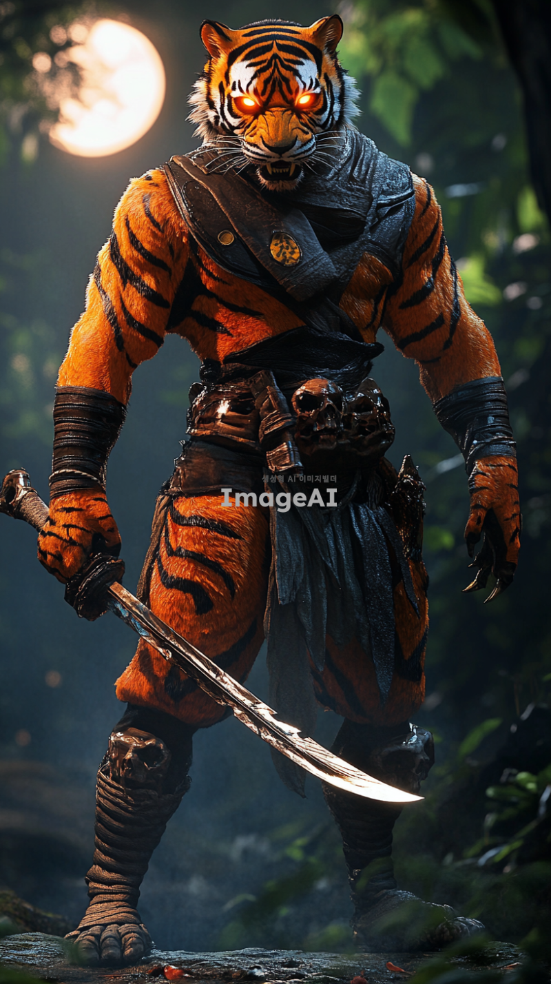 강렬한 공포와 원초적인 힘을 불러일으키는 호랑이에서 영감을 받은 고도로 사실적인 인간형 캐릭터. 강력하고 근육질의 몸체는 생생한 주황색 털로 덮여 있으며, 대담한 검은 줄무늬가 특징이다. 호랑이의 매끄럽고 포식자 같은 모습을 유지하며, 얼굴은 인간과 호랑이의 특징이 혼합되어 있다. 뚜렷하고 빛나는 고양이 눈, 넓은 코, 그리고 사나운 으르렁거림 속에 드러난 날카로운 송곳니가 돋보인다. 손은 발톱 같은 손가락으로 끝나 있으며, 자세는 낮고 공격을 준비하는 모습으로, 원초적인 공격성을 발산한다. 어두운 가죽과 뼈로 만들어진 최소한의 전투 장비를 착용하고 있으며, 발톱과 송곳니 모티프가 장식되어 있다. 이 캐릭터는 호랑이 발톱을 닮은 검을 휘두르며, 희미한 달빛이 나뭇잎 사이로 비치는 안개 낀 정글을 배경으로 하여 은밀함과 치명적인 본성을 강조한다. 전체적인 디자인은 호랑이의 다루지 못할 두려움과 본질을 반영한다.