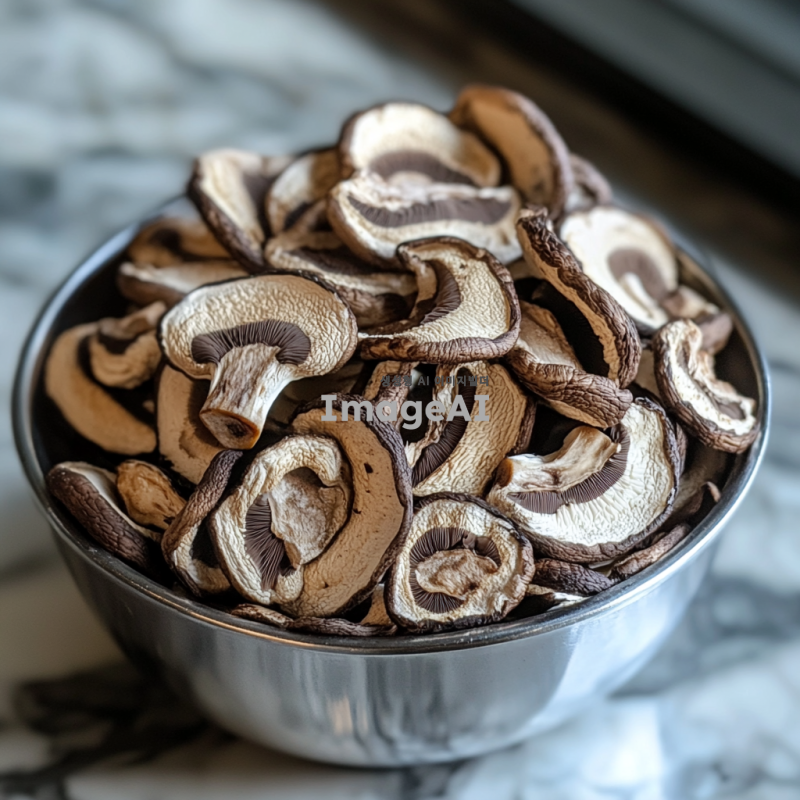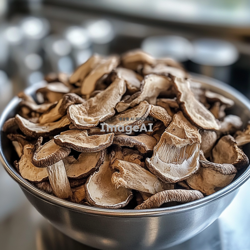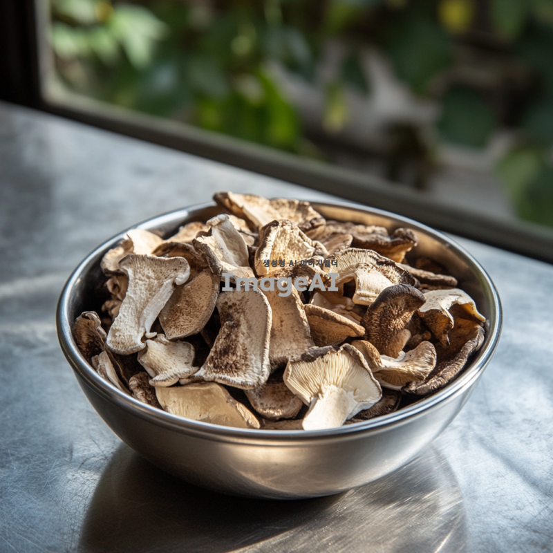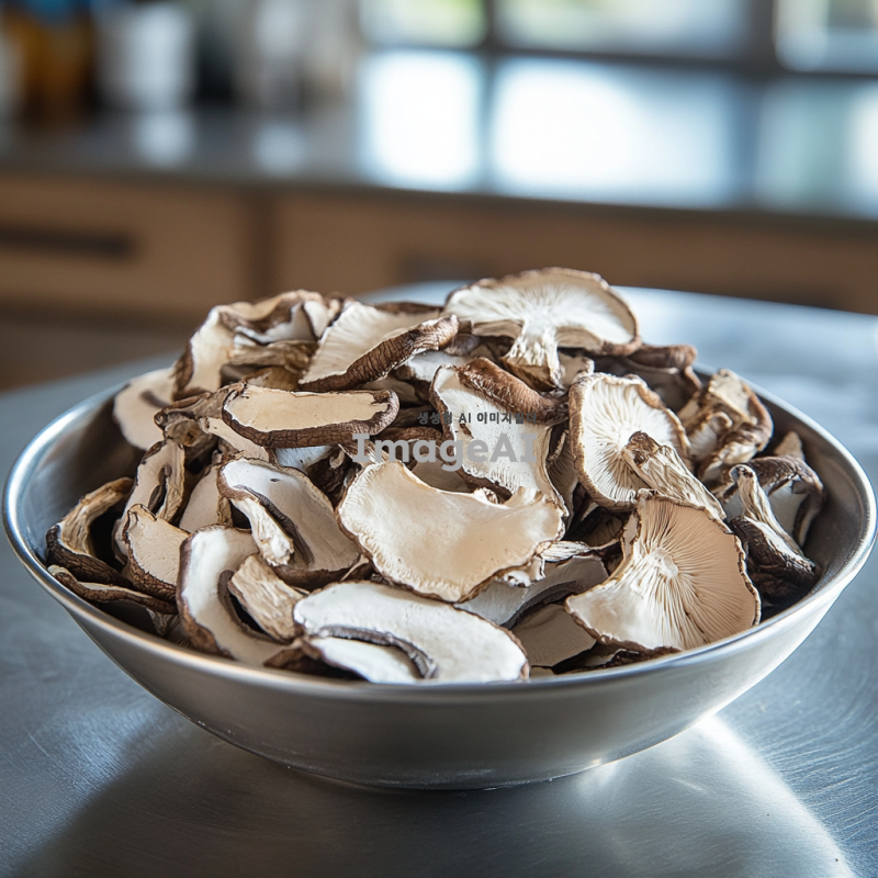 실험실 썰어서 동결 건조된 스텐볼에 여러개의 표고버섯 모습, 깨끗하고 정돈된 실험실 배경, 스텐볼에 건조 표고버섯의 질감과 색상, 과학적이고 전문적인 느낌, 자연광이 비치는 환경, 세밀한 디테일 강조