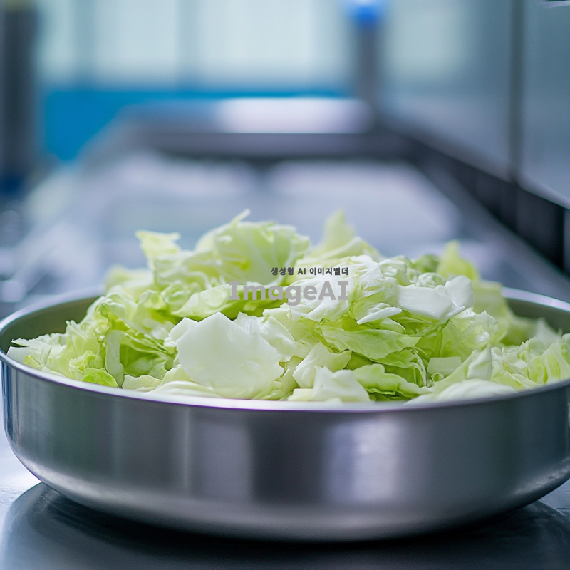실험실의 스텐볼 안에 볶아서 동결건조한 썰어놓은 배추잎이 담겨 있는 모습, 배경은 깨끗한 실험실 환경, 조명은 부드럽고 자연스러운 느낌, 배추잎의 질감과 색상이 잘 드러나도록 촬영된 이미지
