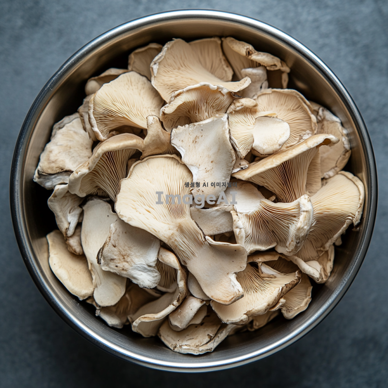 실험실 스텐볼에 담긴 썰어서 동결건조한 느타리버섯, 섬세한 질감과 자연스러운 색감, 깨끗한 배경, 과학적인 느낌 강조, 조명이 부드럽고 자연스러움, 고해상도 이미지