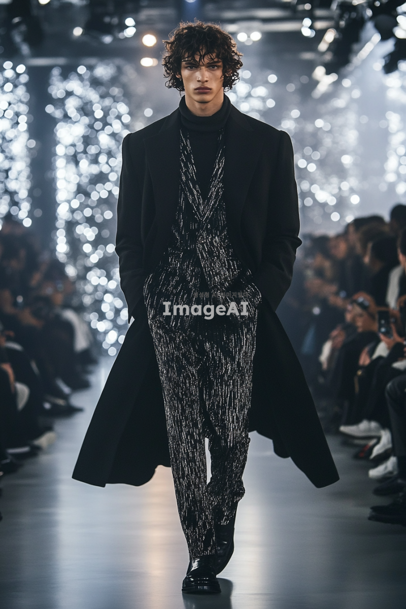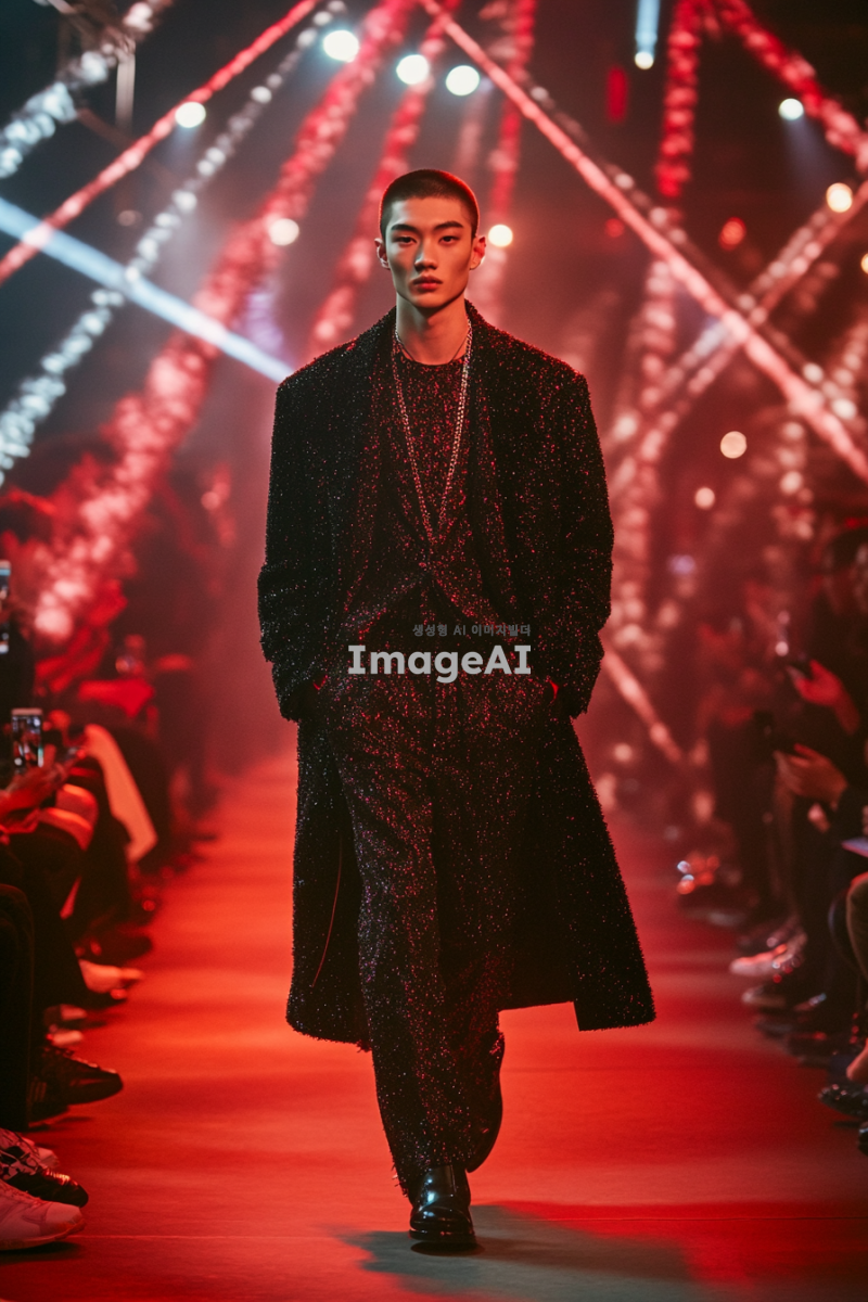 락시크 스타일 수트를 입고 매트릭스 스타일의 검은색 코트를 걸친 남자 모델이 패션쇼장에서 포즈를 취하고 있는 모습. 배경은 화려한 조명과 세련된 관객들로 가득 찬 런웨이로, 모델의 자신감 넘치는 표정과 독특한 스타일이 강조되도록. 전체적인 분위기는 현대적이고 혁신적인 패션의 느낌을 주며, 세밀한 디테일이 잘 드러나도록 구성. 악세사리 많이.