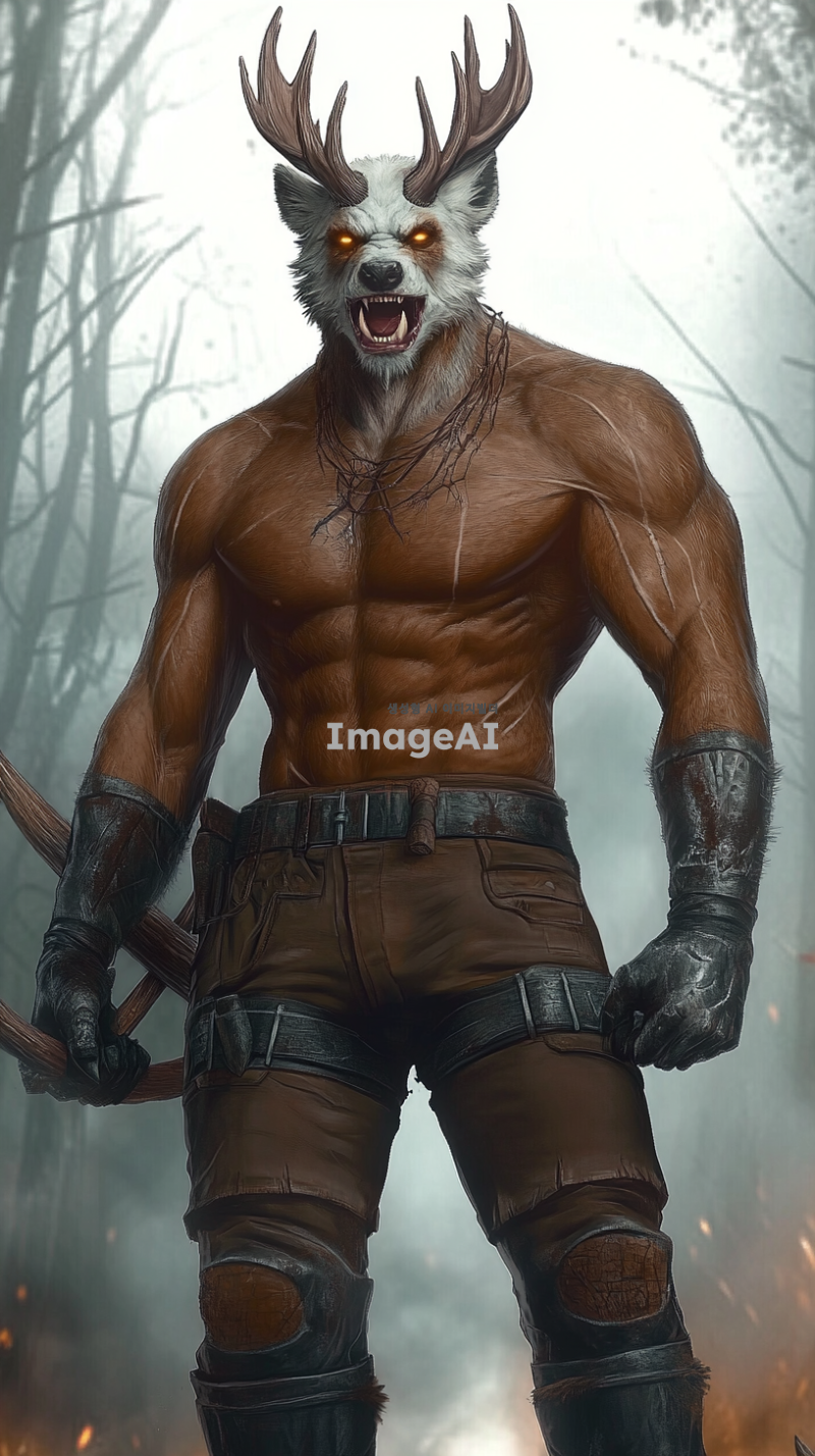 사슴에서 영감을 받은 고도로 사실적인 인간형 캐릭터로, 섬뜩하고 원초적인 우아함을 불러일으키도록 디자인되었습니다. 이 캐릭터는 키가 크고 날씬하며 근육질의 인간형 몸을 가지고 있으며, 매끄럽고 갈색의 털로 덮여 있고, 가슴과 팔다리에는 하얀 반점이 있어 사슴의 자연스러운 외형을 연상시킵니다. 얼굴은 인간과 사슴의 특징이 융합되어 있으며, 크고 빛나는 호박색 눈, 약간 길게 뻗은 주둥이, 그리고 희미한 이끼와 덩굴로 장식된 날카롭고 가지가 뻗은 웅장한 뿔이 돋보입니다. 표정은 차분하면서도 섬뜩한 강렬함을 지니고 있으며, 지혜와 위협이 혼합된 분위기를 발산합니다.