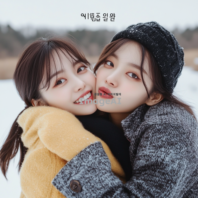겨울 옷을 입고 자연스럽게 포즈를 취하고 있는 한국인 여성 모델 두 명. 한 모델은 다른 모델을 뒤에서 안고 있으며, 두 사람 모두 환하게 웃고 있는 모습. 배경은 겨울의 따뜻한 분위기를 연출하는 눈 덮인 풍경으로 설정.