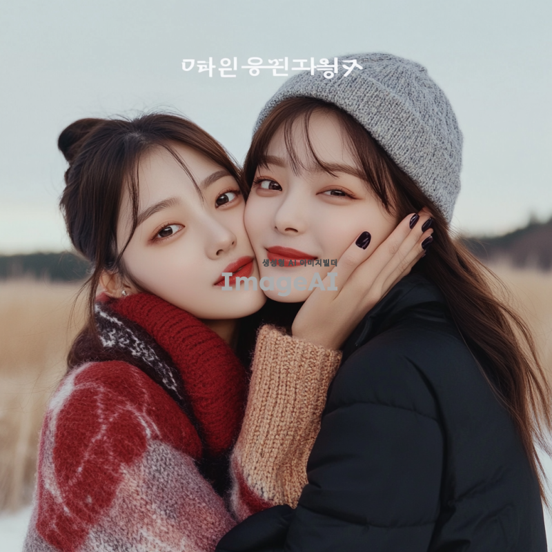 겨울 옷을 입고 자연스럽게 사진을 찍고 있는 한국인 여성 모델 2명. 한 모델은 다른 모델을 뒤에서 안고 있으며, 두 모델 모두 웃고 있는 모습. 배경은 겨울의 따뜻한 느낌을 주는 풍경으로 설정.
