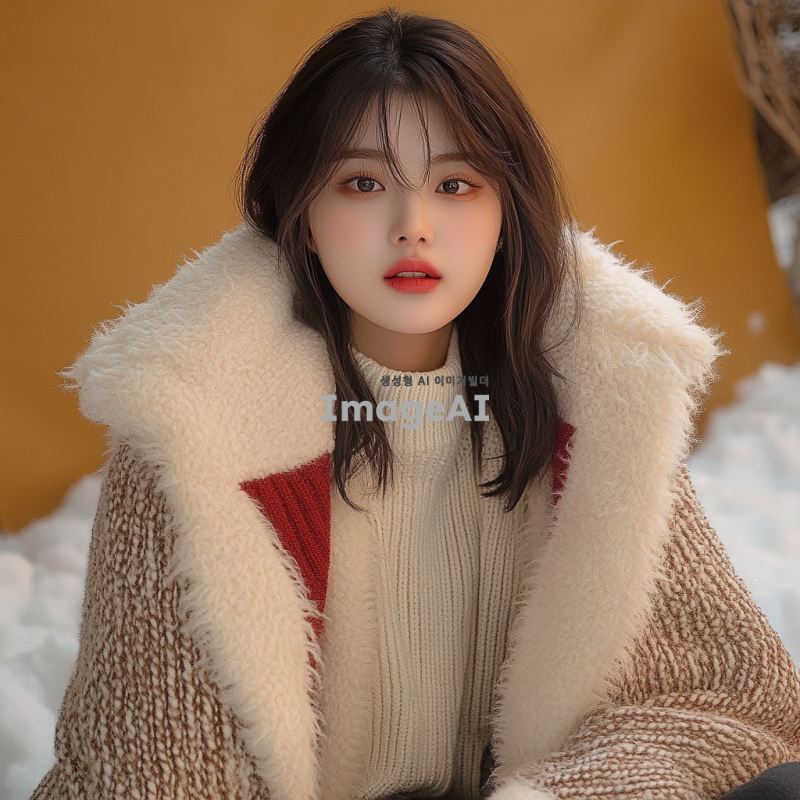 겨울 옷을 입고 자연스럽게 포즈를 취하는 한국인 여성 모델, 부드러운 조명 아래에서 따뜻한 색감의 배경, 눈이 내리는 겨울 풍경 속에서 편안한 표정으로 촬영된 모습, 스타일리시한 겨울 패션 강조, 실내 또는 실외 촬영 가능, 자연스러운 미소와 함께 다양한 각도에서의 포즈