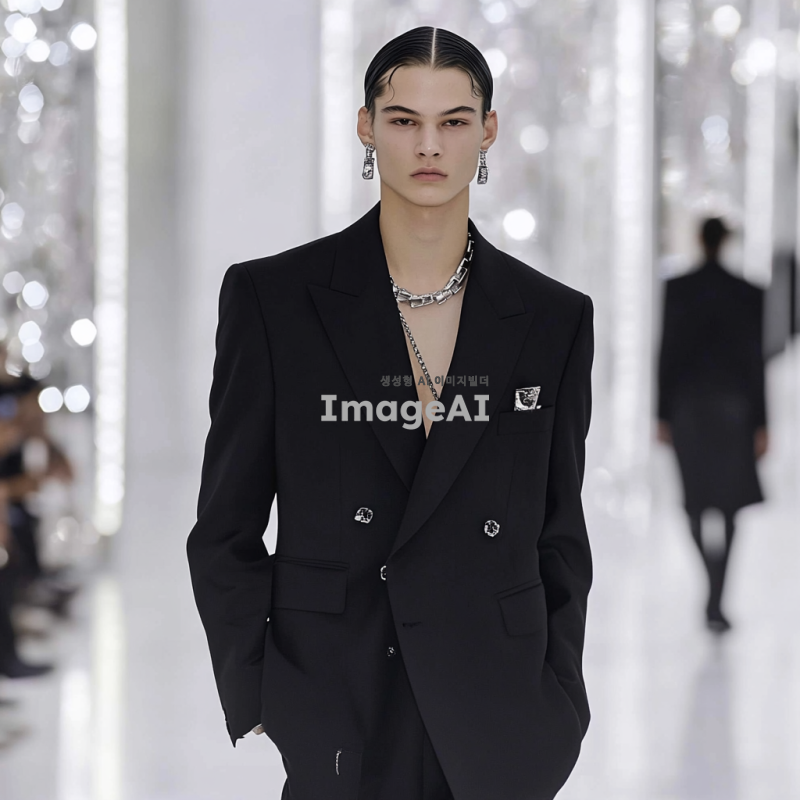 남성 모델이 현대적인 디자인의 검은색 정장과 바지를 입고 런웨이를 걷고 있다. 실버 귀걸이와 목걸이를 매치했다. 배경은 미니멀리스트 스타일의 디자인 요소가 가미된 흰색이다. 디올의 고급 패션쇼는 고화질 사진을 특징으로 한다.