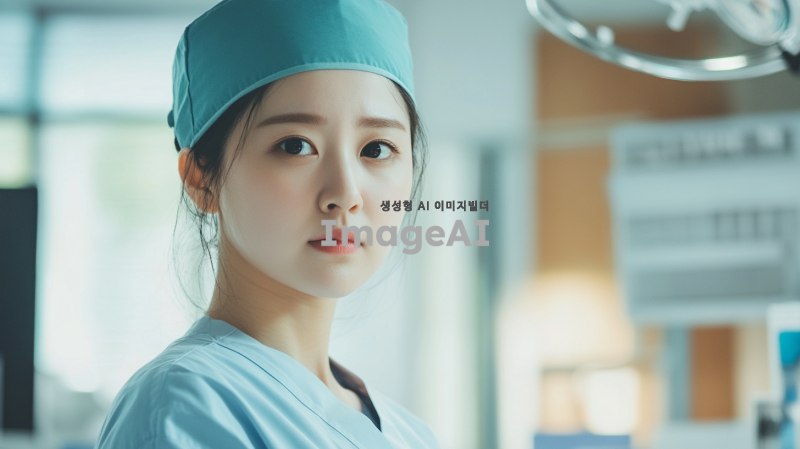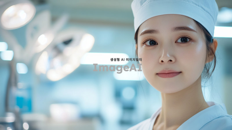간호모자를 쓰고 단상에서 교육을 진행하고 있는 한국인 간호사의 모습. 밝고 단정한 분위기로, 청중을 향해 설명하는 모습이 담긴 이미지. 주변에는 교육 자료와 간호 관련 도구들이 배치되어 있으며, 따뜻한 조명이 비추는 공간. 간호사의 표정은 친절하고 자신감 넘치며, 전문적인 느낌을 주는 의상과 함께.