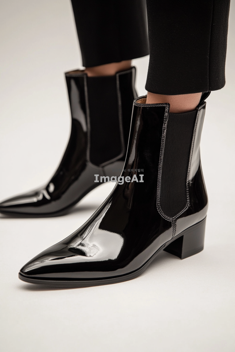 생로랑 스타일의 첼시 부츠, 미니멀하고 현대적이며 시크한 디자인, 날렵한 형태, 뾰족한 앞코, 미니멀한 실버 포인트, 배경은 밝은 색의 바닥으로 제품이 잘 보이도록 구성된 패션쇼 참고용 착장 사진.